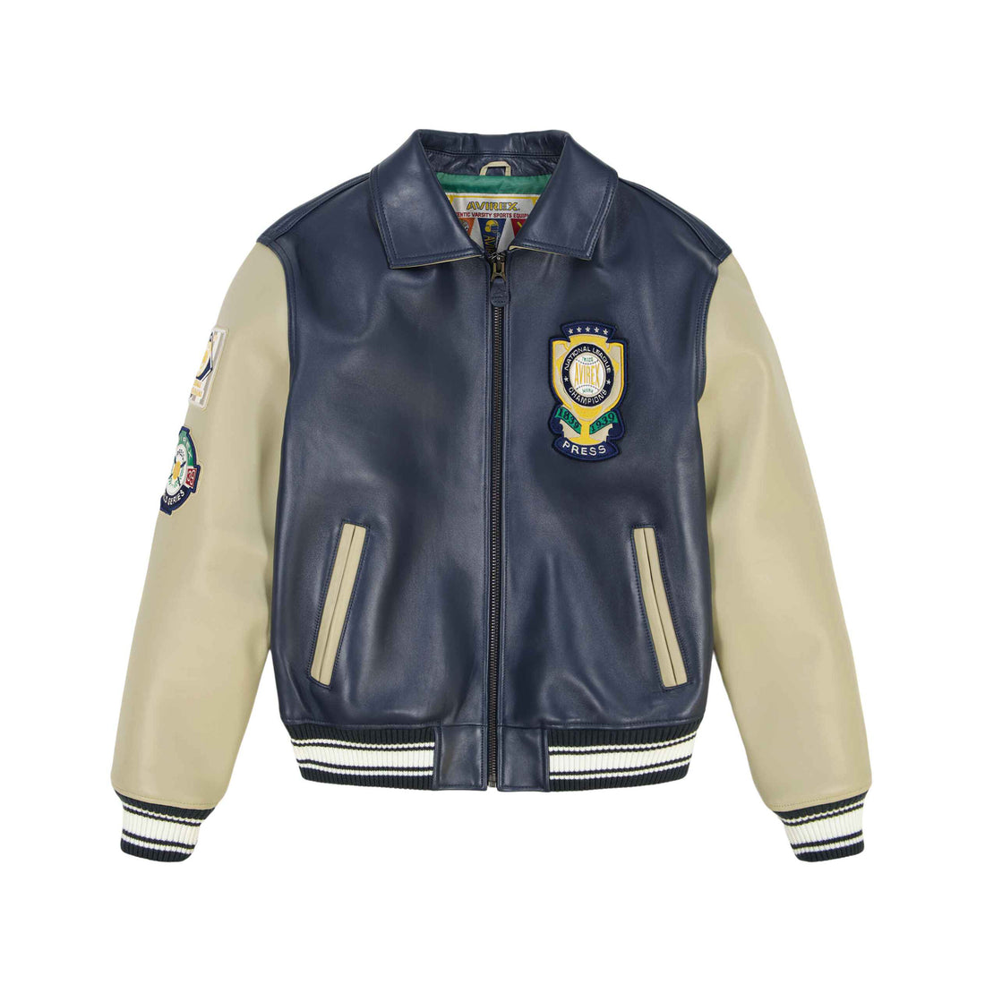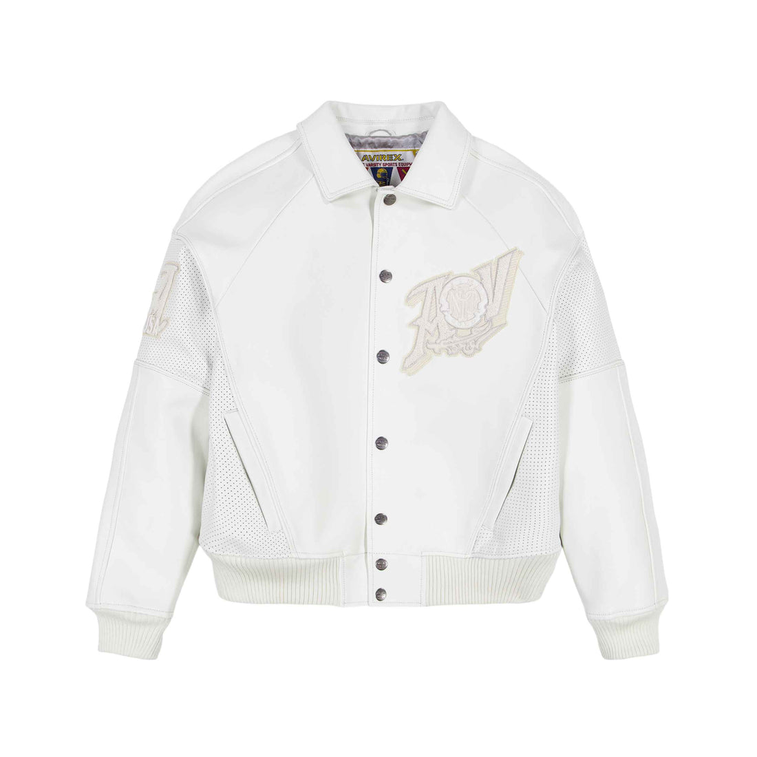 Details Chenille-Stickerei und perforierte Einsätze. Lederjacke Chenille-Stickerei Applikations-Patch-Kunst Authentischer „A“-Wappenaufnäher am hinteren Kragen Perforierte Verkleidung...