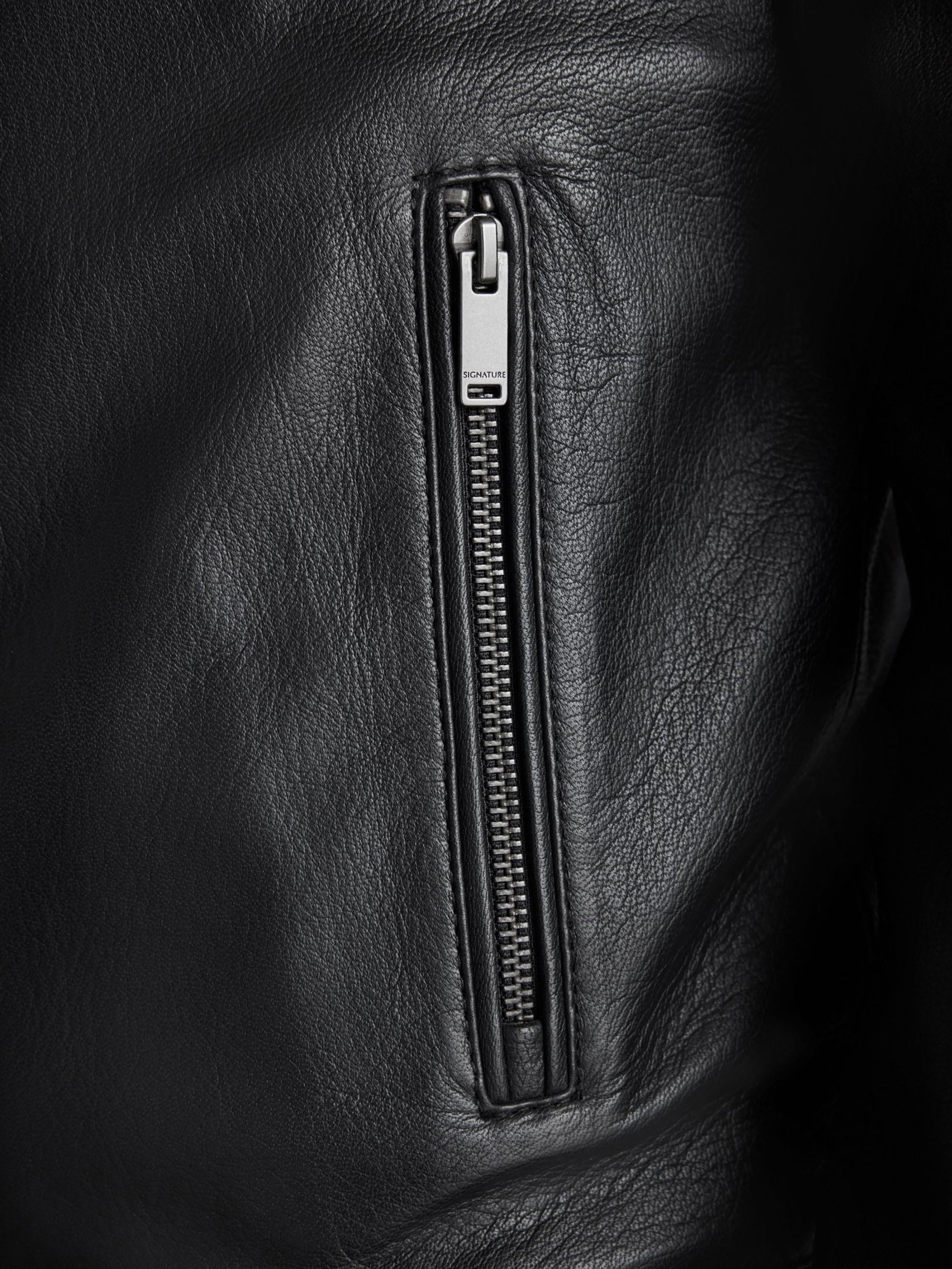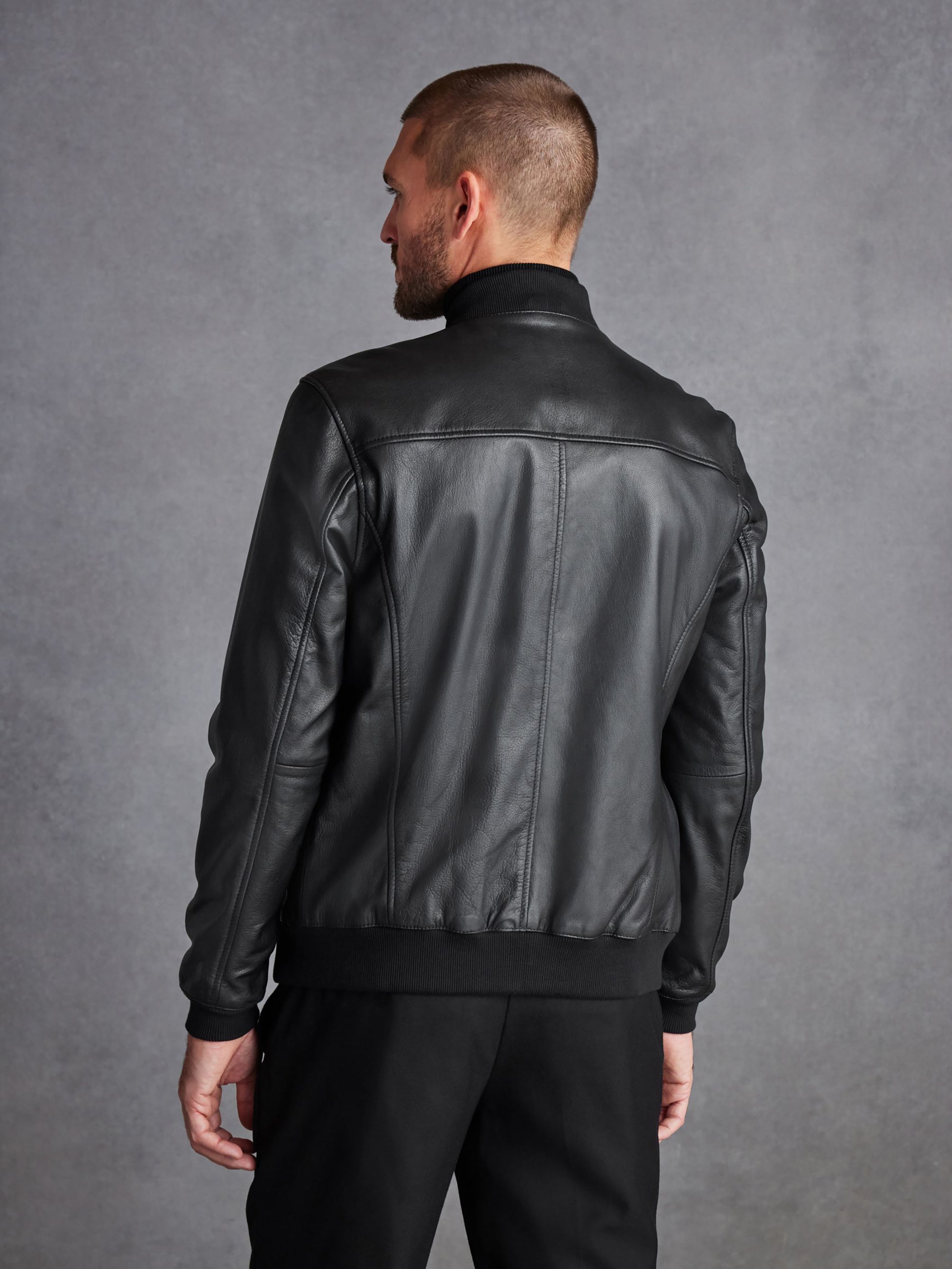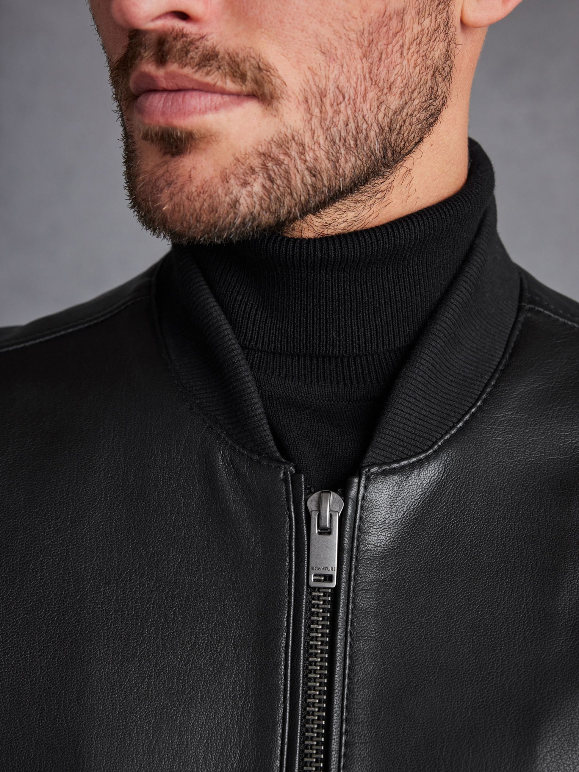 Die Bomberjacke ist ein zeitloses Herrenbekleidungsstück. Sie ist vielseitig und trendy und kann einen Look sowohl aufpeppen als auch schlichter machen. Diese kantige Signature-Bomberjacke aus Leder ist eine originelle und zeitlose Oberbekleidungsoption. Mit Leistentasche innen, Gunmetal-Besatz und geripptem Saum und Bündchen ist sie ein Must-have für jede Garderobe, das Sie durch alle Jahreszeiten begleitet.