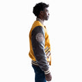 Die Bear Goat Collegejacke zeigt einen Bären, der über seine Schulter blickt. Begleitet wird dieser Top Gun-Bär von einem dreidimensionalen gestickten Schriftzug, der stolz das Motto „FEAR THE GOAT, NEVER GIVE UP“ zeigt. Die Jacke ist mit viel Liebe zum Detail gefertigt. Sie besteht aus einem Wollmix mit kontrastierenden Ärmeln aus veganem Leder und gestreiften Rippbündchen. Das dicke Steppfutter hält Sie warm.