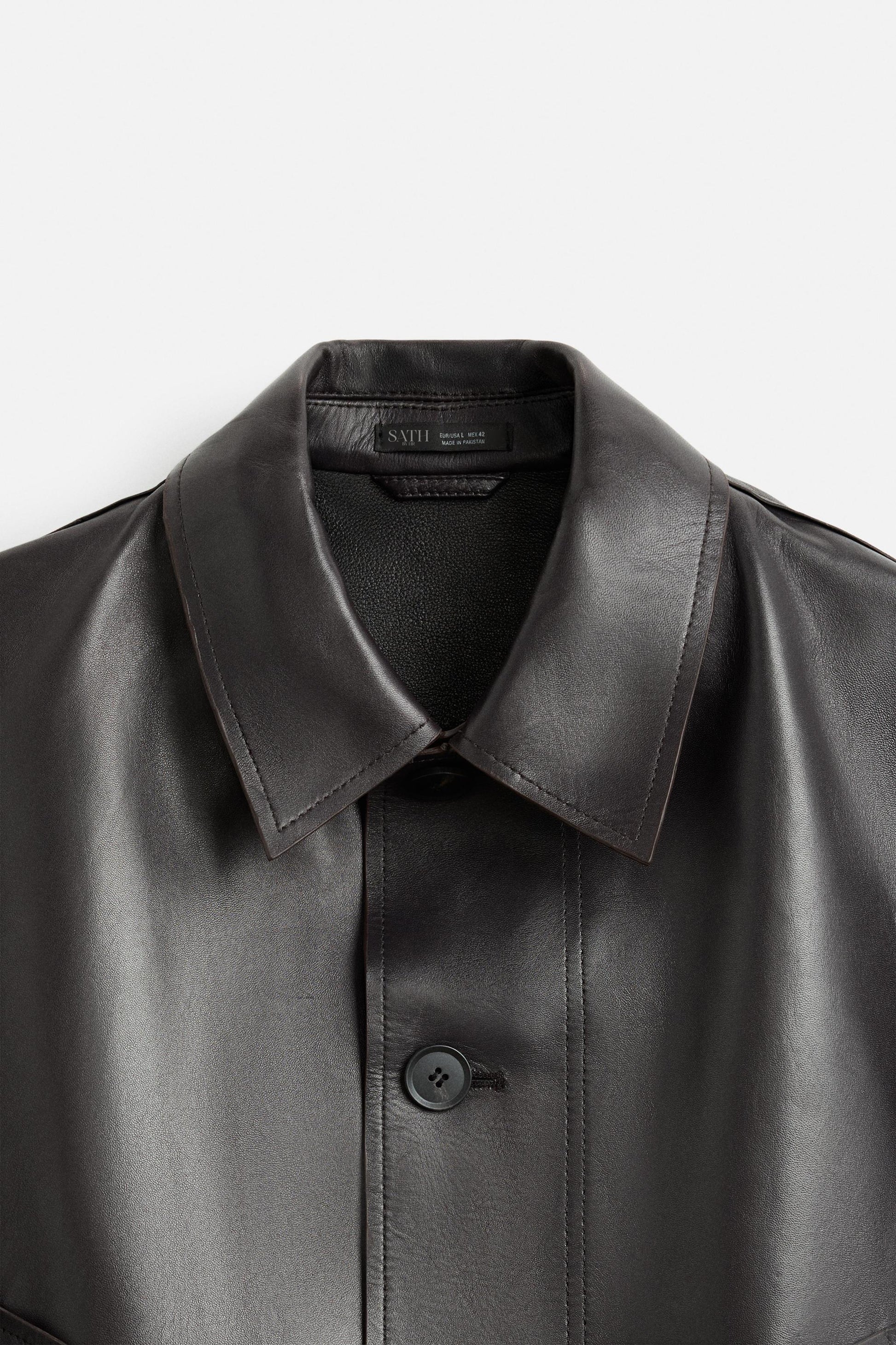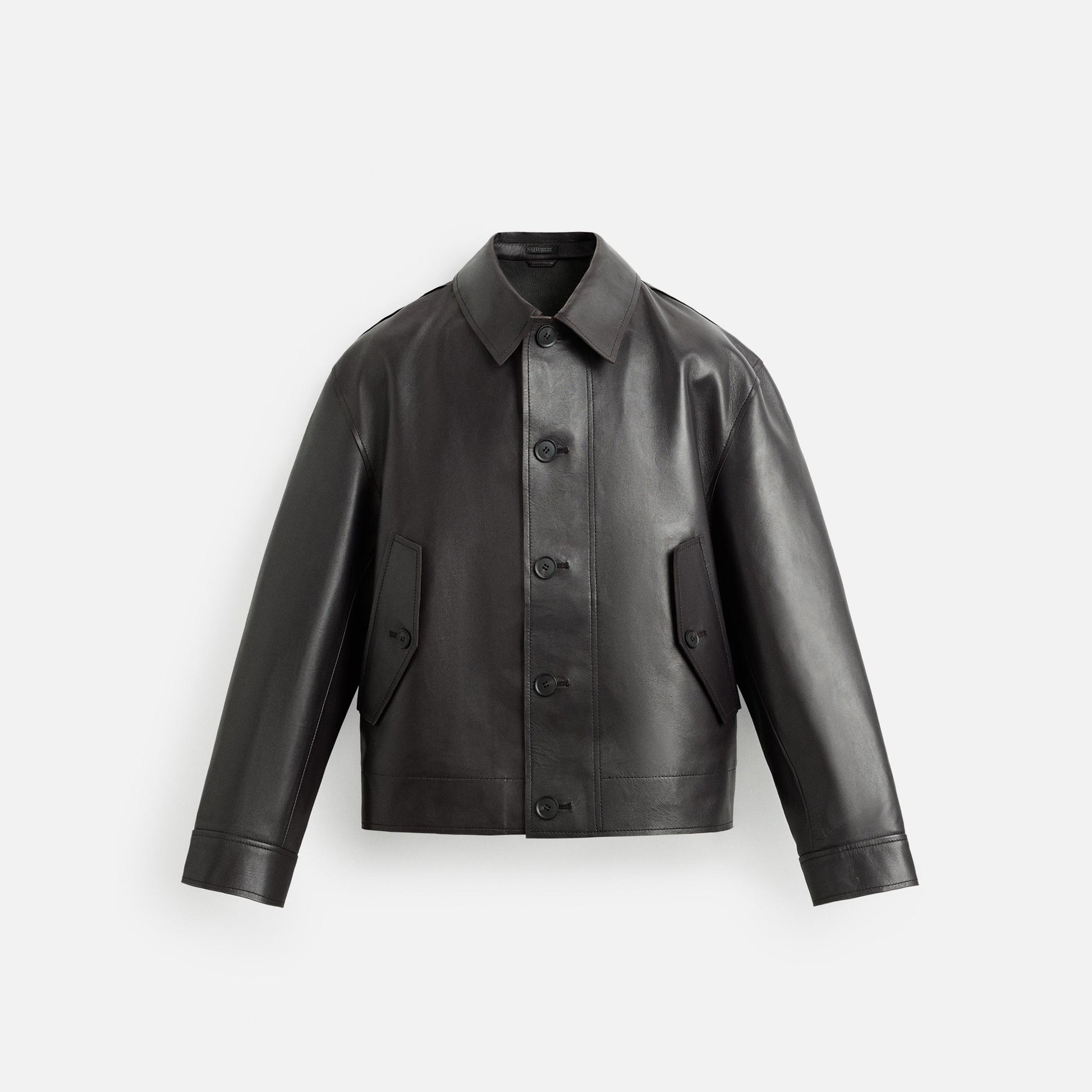 Lederjacke im verkürzten Schnitt. Reverskragen und lange Ärmel mit geknöpften Manschetten. Pattentaschen an der Hüfte. Knopfverschluss vorne.