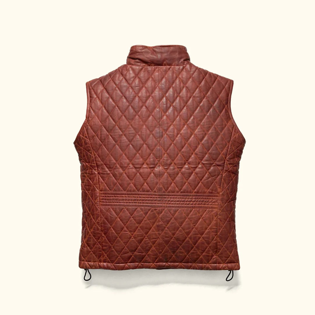 Inspiriert von der rauen Schönheit der schottischen Highlands, wo in den nebligen Tälern noch immer alte Legenden lauern, haben wir eine Weste geschaffen, die zeitlosen Luxus und Eleganz verkörpert. Wir präsentieren die Highlands Leather Quilted Vest – ein wahrer Inbegriff rauer Eleganz, gefertigt aus feinstem, whiskybraunem Schaffell.