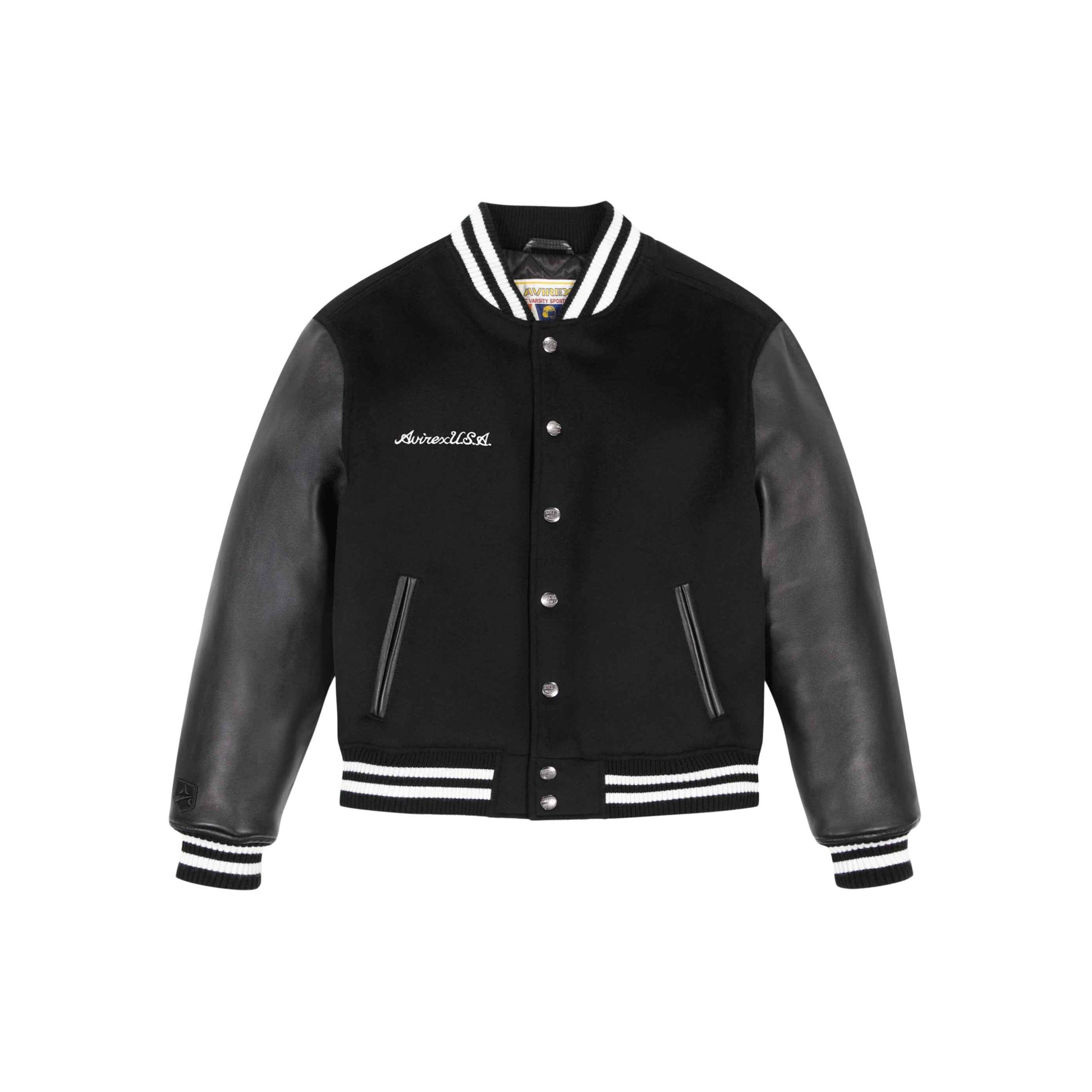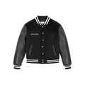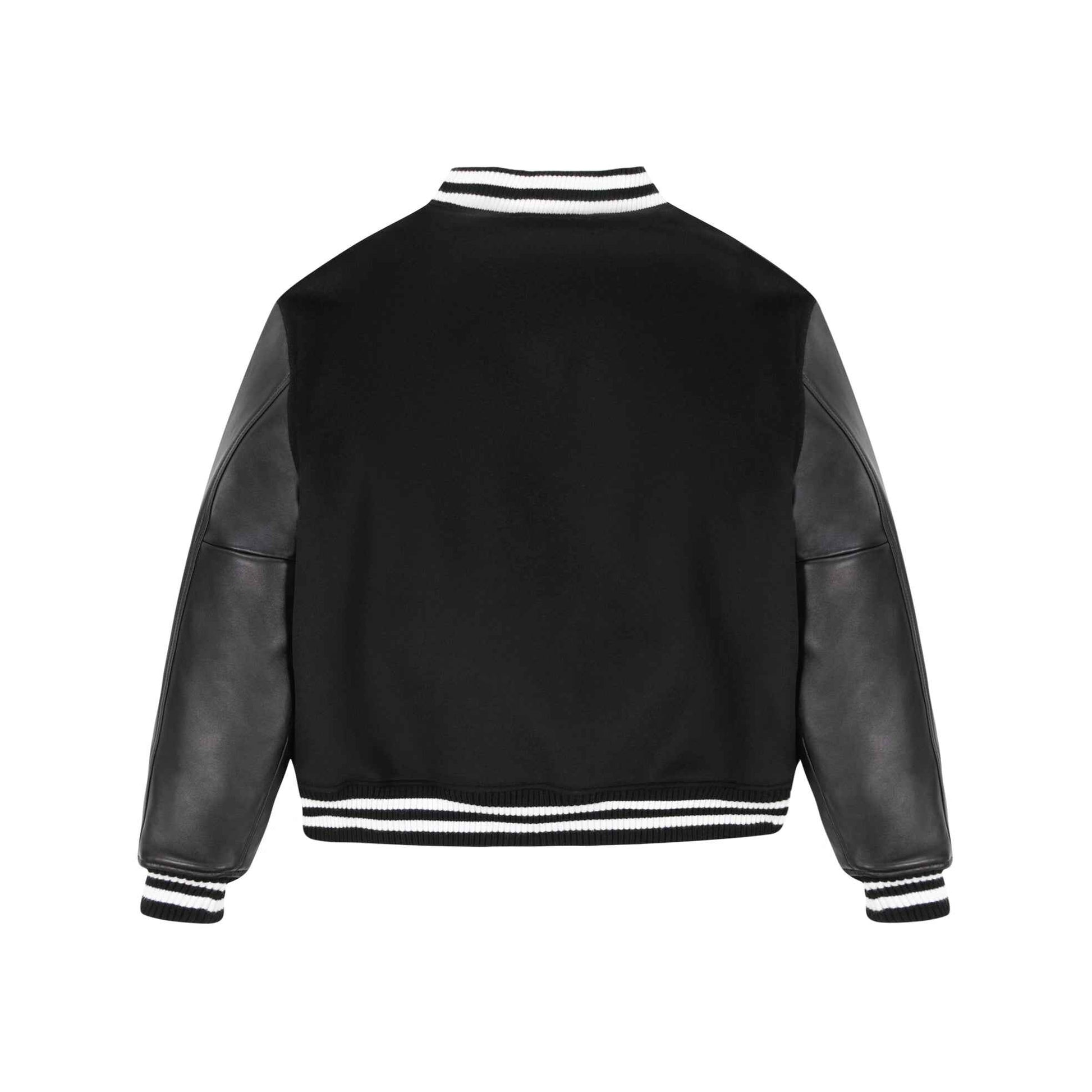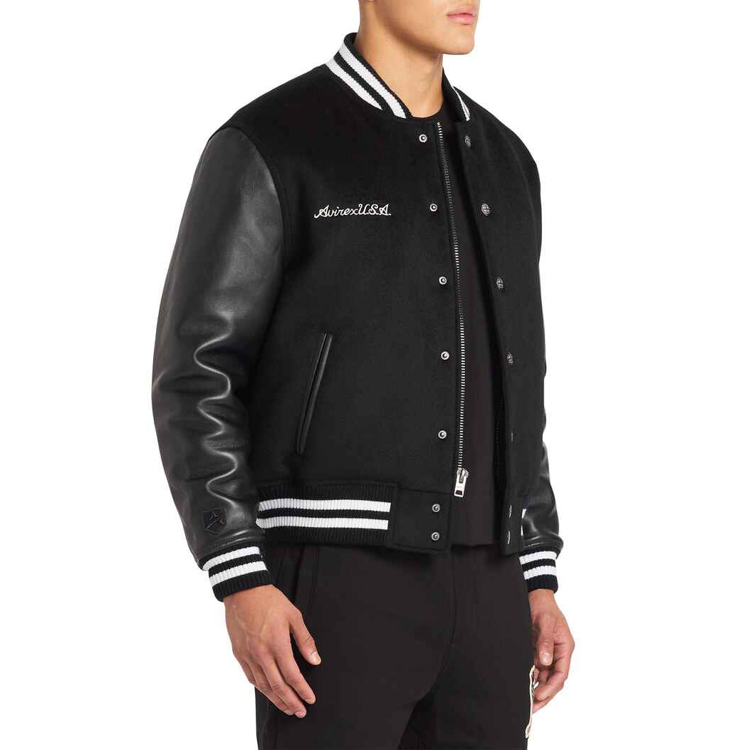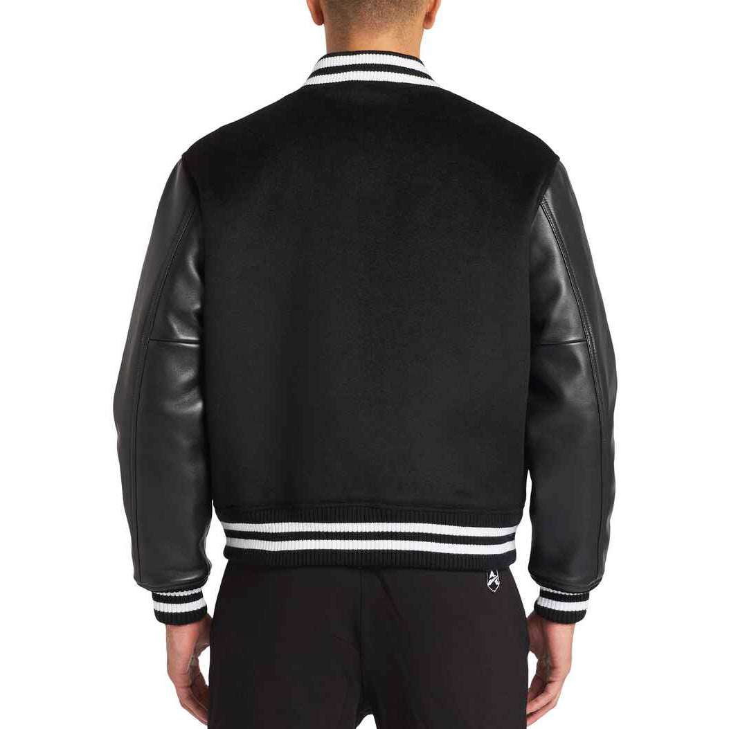Schwarze Varsity-Lederjacke aus Wolle mit gestreiftem Kragen für Herren