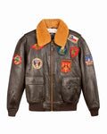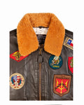 Die offizielle Top Gun G-1 Fliegerjacke würdigt die Dienstgeschichte der Elite-Kampfpiloten der Navy. Diese Jacke besteht aus 100 % geschmeidigem, antikem Lammleder mit Bi-Swing-Rücken und abnehmbarem Mouton-Pelzkragen. Auf dem Rücken der Jacke befindet sich ein Blood Chit mit einer Rettungsbotschaft in vier verschiedenen Sprachen neben der US-Flagge. Diese Nachricht bittet die Zivilbevölkerung vor Ort um Hilfe im Falle einer Verletzung oder Strandung und verspricht eine Belohnung für ihre Hilfe. Blood Chits dienten als eine Art Versicherung für Militärangehörige; ihre Ursprünge reichen bis in den Zweiten Weltkrieg und frühere Konflikte zurück.