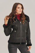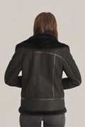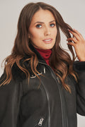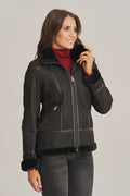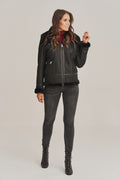 Damen Winterjacke aus Schaffell im Pilotenstil in Schwarz. Hergestellt aus imprägniertem, natürlichem Lammfell. Sie hat zwei Eingrifftaschen, einen hohen Kragen mit Kinnverschluss und dekorative Reißverschlüsse an den Ärmeln. Saum, Kragen und Ärmel sind aus Narbenleder gefertigt. Winter-Bikerjacke mit Fell, sehr leicht, weich und angenehm zu tragen. Perfekt für den Alltag.