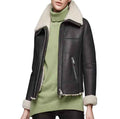 Schwarze Oversize-Lederjacke aus Shearling mit Pelzkragen für Damen