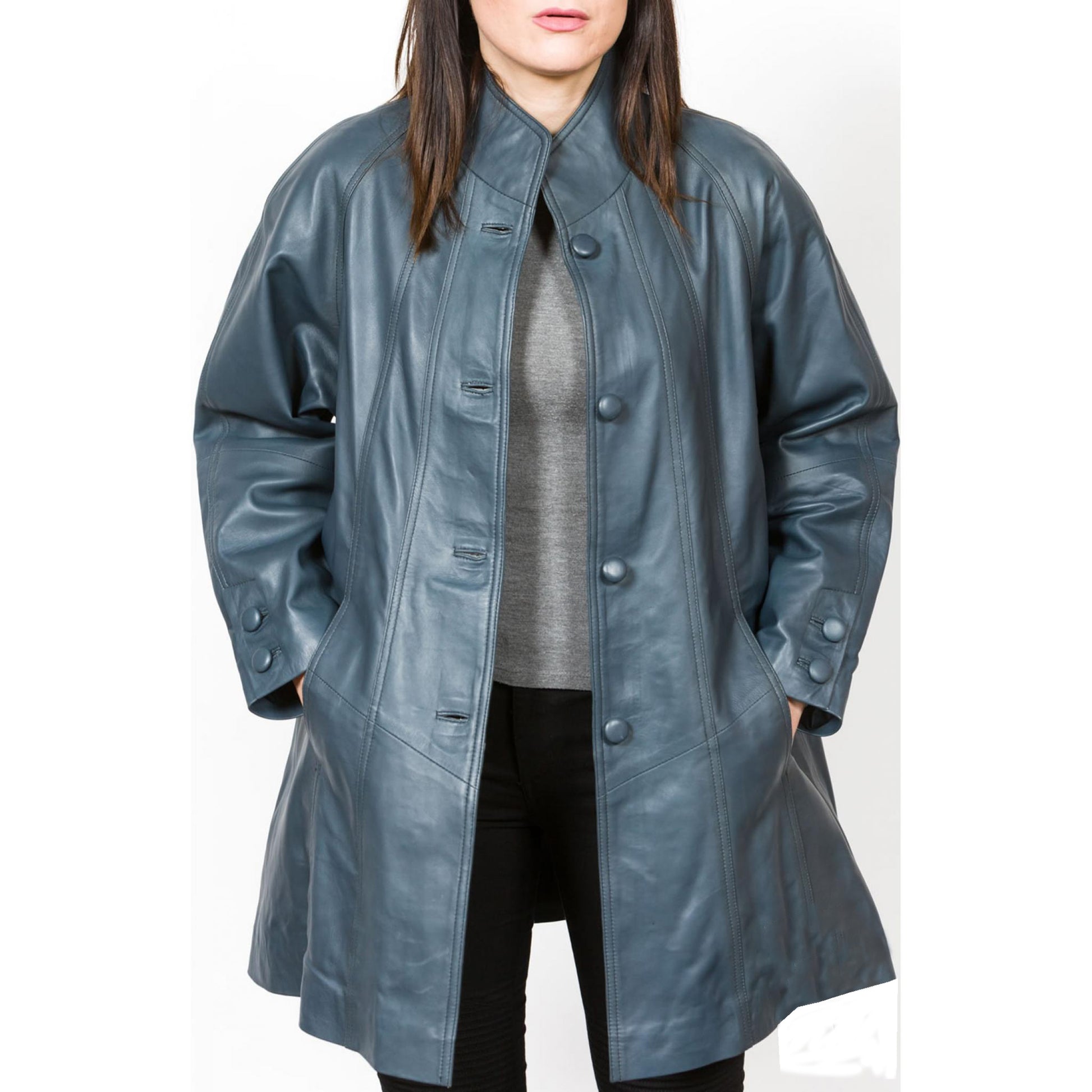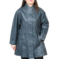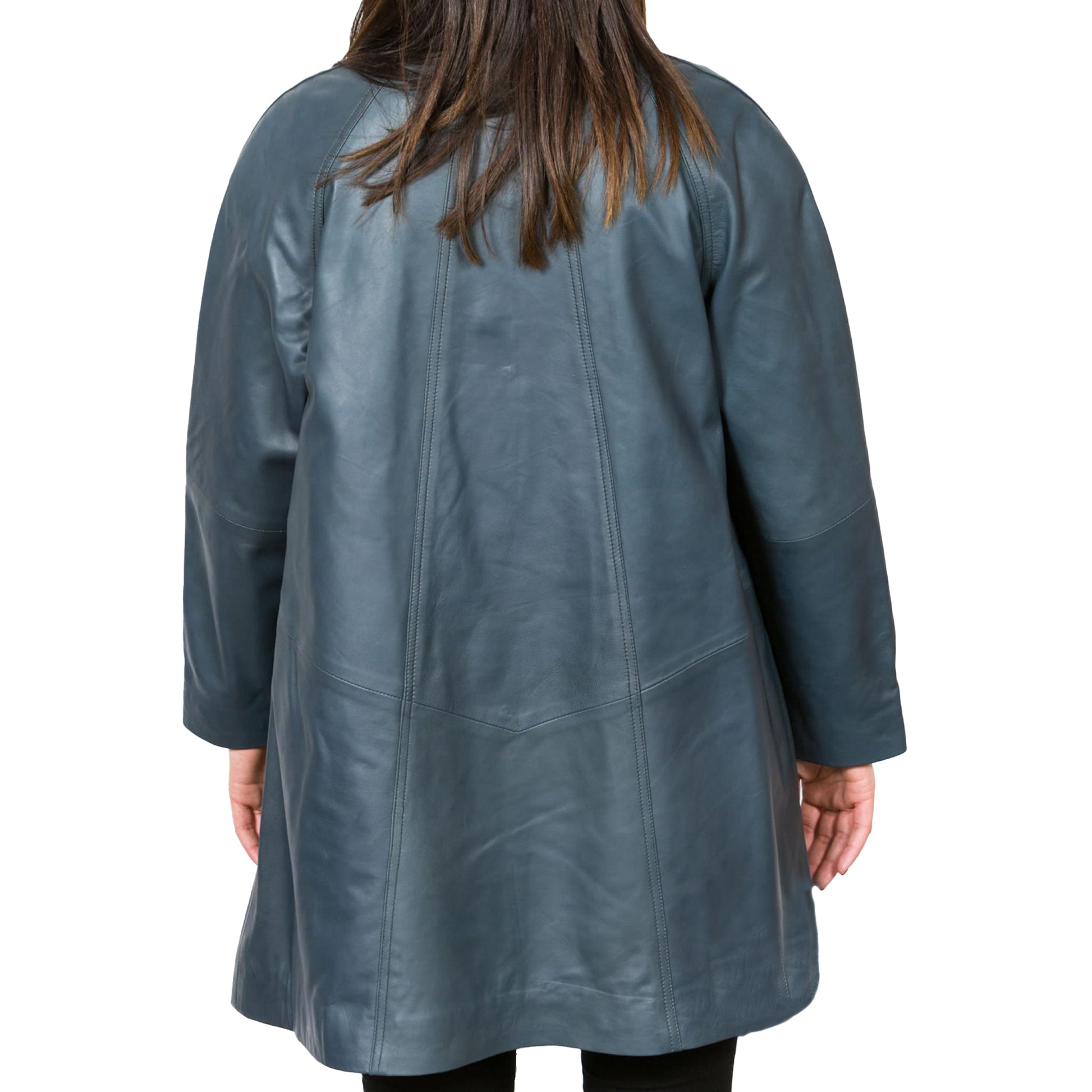 Ein klassischer, knielanger blauer Swing-Ledermantel für Damen aus weichem Nappaleder für ganztägigen Komfort. Leder hält den Wind ab und isoliert vor Kälte.