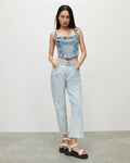 Stylen Sie es nach Ihren Wünschen. Dieses Korsett aus gewaschenem Denim hat eine schlichte Silhouette, die schmeichelt. Tragen Sie es doppelt oder dezent über einem maßgeschneiderten Anzug – es passt zu allem.