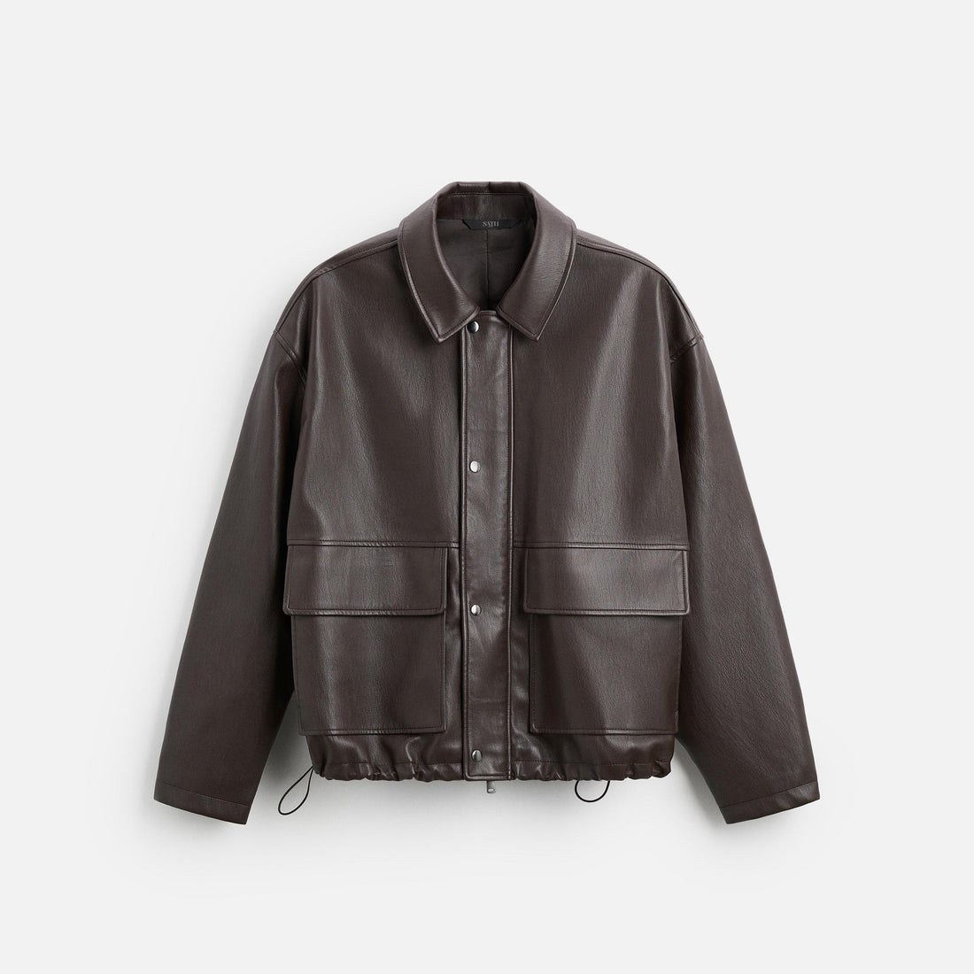 Chaqueta de cuero de corte regular. Cuello con solapa y manga larga. Bolsillos de parche...