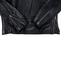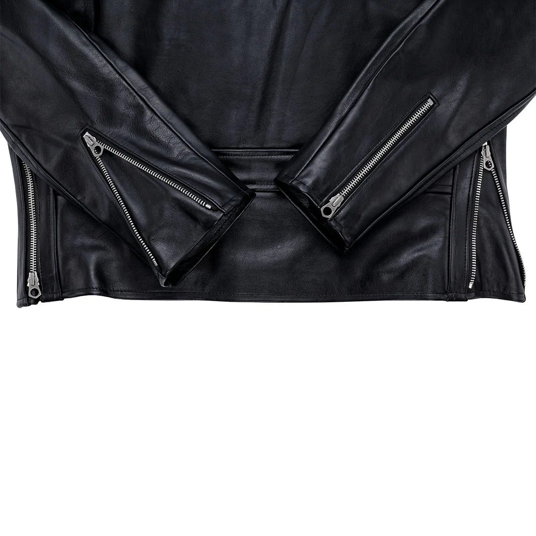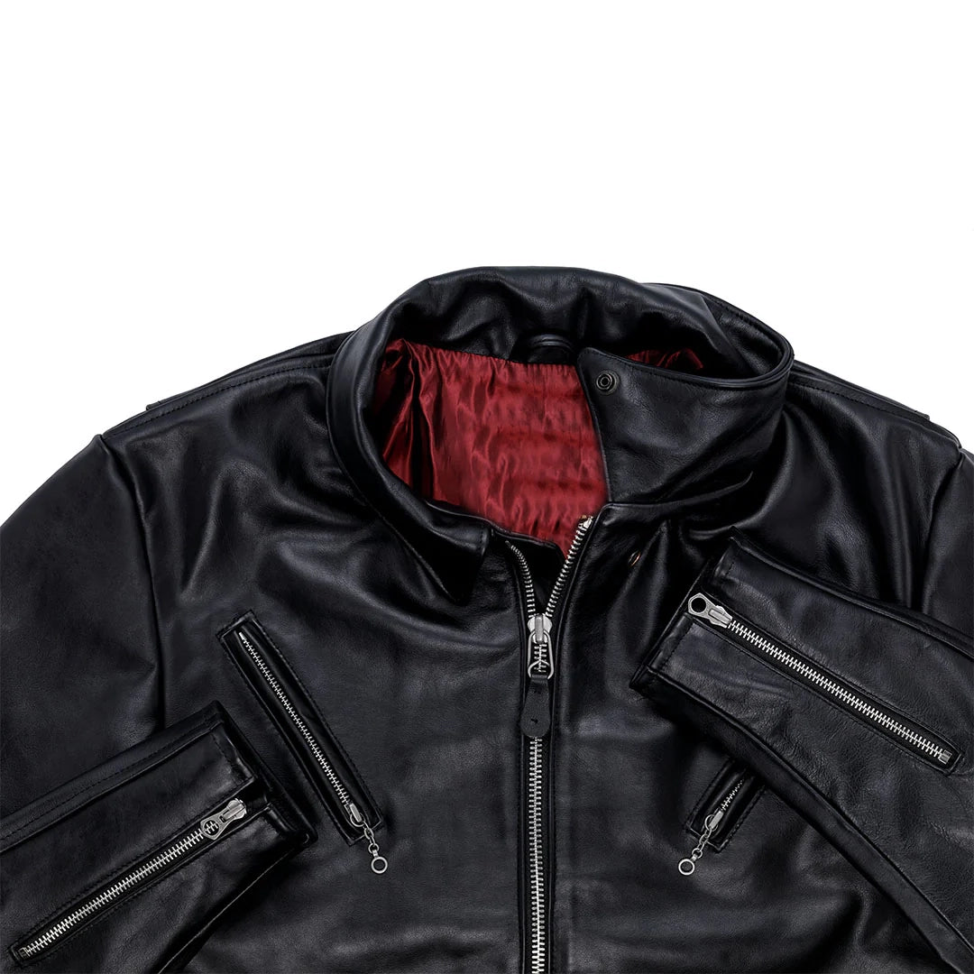 Esta chaqueta de moto Victory Rider de cuero negro está inspirada en una chaqueta de moto vintage de los años 30 que usaba Jhon Show, propietario de SATH. Fabricada con los mejores materiales, el cuero es un cuero de caballo natural, resistente, de plena flor y con peso de moto. El forro de la chaqueta de moto de cuero negro es una sarga lisa roja de motociclista típica de los años 30. Su silueta está inspirada en una admirada chaqueta de moto vintage, la Town Squire. Completa con cremallera frontal, así como bolsillos laterales y en el pecho con cremallera, esta chaqueta de moto evoca la primera era de la cultura motociclista. Las cremalleras usan un tirador de cadena que fue replicado para completar la sensación vintage. Cuando se cierra la cremallera, las mangas se estrechan ligeramente para protegerse del viento frío. Con esta versión original de un clásico americano, nuestra chaqueta de moto de los años 30, fabricada en EE. UU. en cuero negro, te llevará a la victoria.