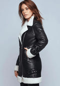 Abrigo largo de piel de oveja blanca con cuello negro para mujer