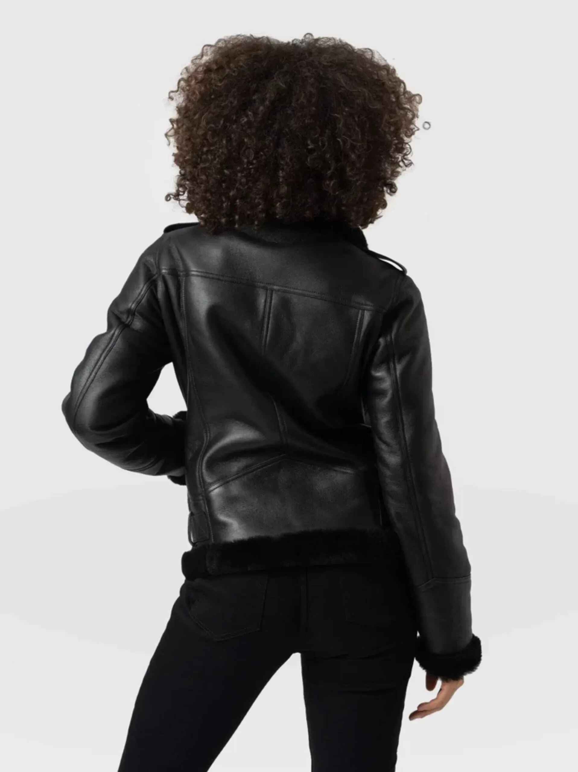 Chaqueta de piel de oveja con cinturón negro para mujer