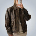 Chaqueta holgada de cuero marrón desgastada retro de los años 80 para mujer