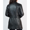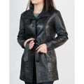 Un abrigo clásico con botones de largo 3/4 confeccionado en cuero negro suave de calidad superior con un cinturón completamente de cuero y un cuello alto con botones para usar doblado hacia abajo o hacia arriba.