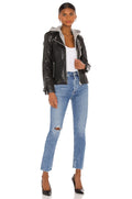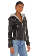 Chaqueta de cuero negra sencilla para mujer con capucha desmontable