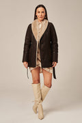 Piel de oveja natural para mujer, extremadamente cálida, hasta la cadera. Hecha de auténtica piel de cordero marrón chocolate, suave y ligera, con pelo claro. Se cierra con botones. Tiene dos bolsillos interiores y un cinturón anudado a la cintura. El ribete y el cinturón son de piel flor natural ligeramente más oscura. Es perfecta tanto para looks elegantes como para el día a día.