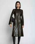 Gabardina larga de cuero verde oscuro de corte entallado para mujer