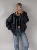 Chaqueta bomber extragrande de piel de oveja negra para mujer