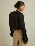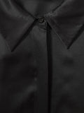 Elige la camisa Hailey negra, confeccionada en seda suave para una sensación sensual y un look lujoso. Se realza con un cierre de botones ocultos y puños extragrandes y llamativos.