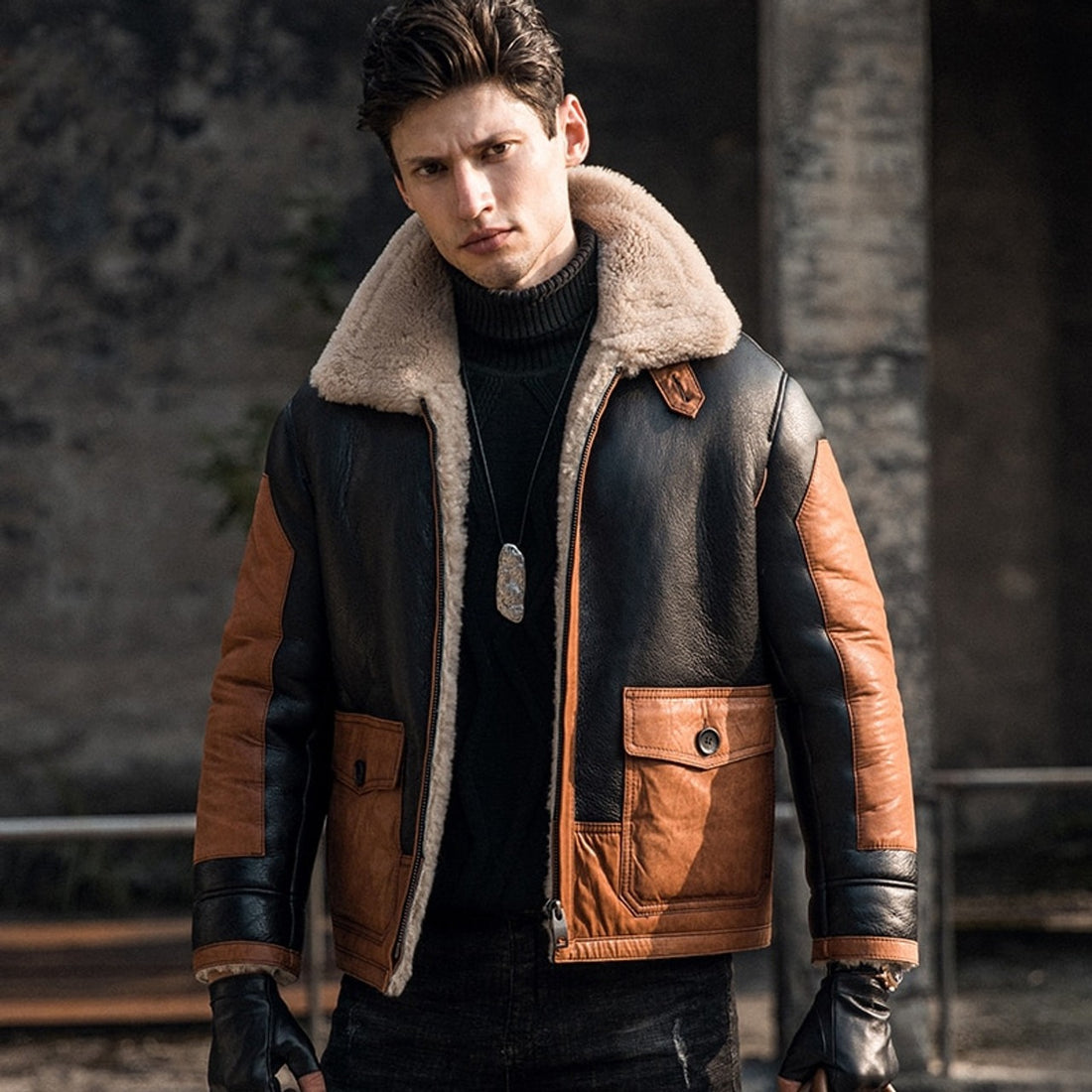 Description Experience unparalleled warmth and style with the men's b7 fur shearling leather coat. Crafted from...
