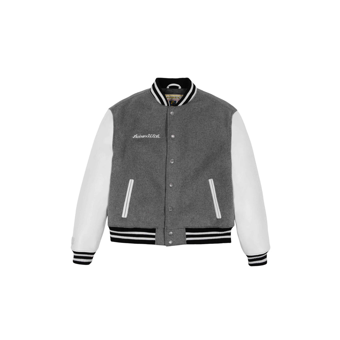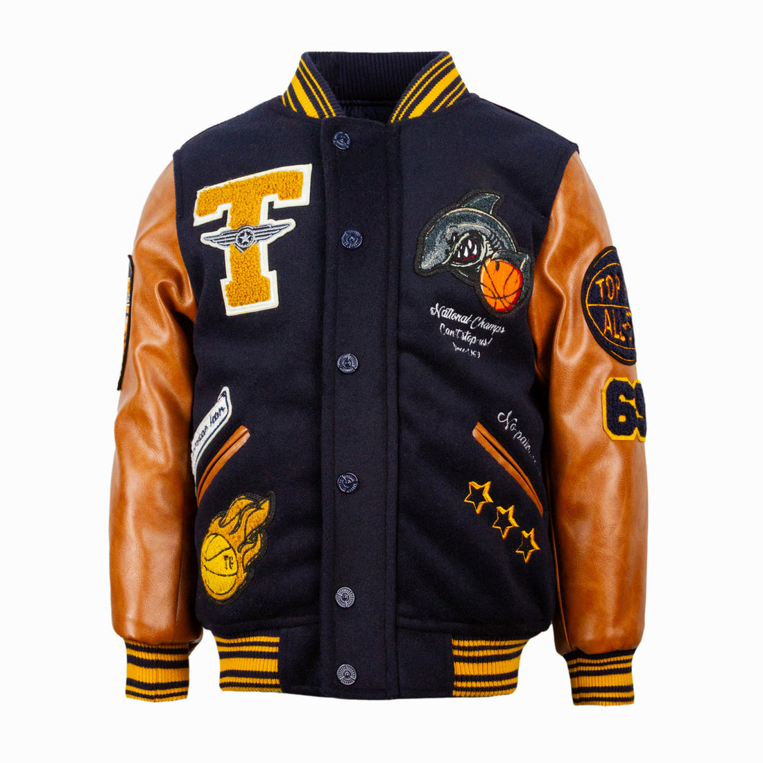 Flying Legend Varsity Jacket is crafted from wool blend with contrasting color PU leather sleeves...