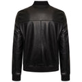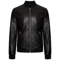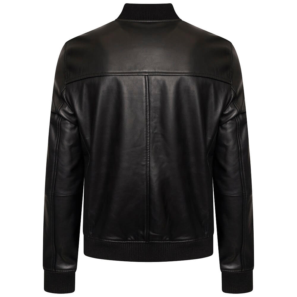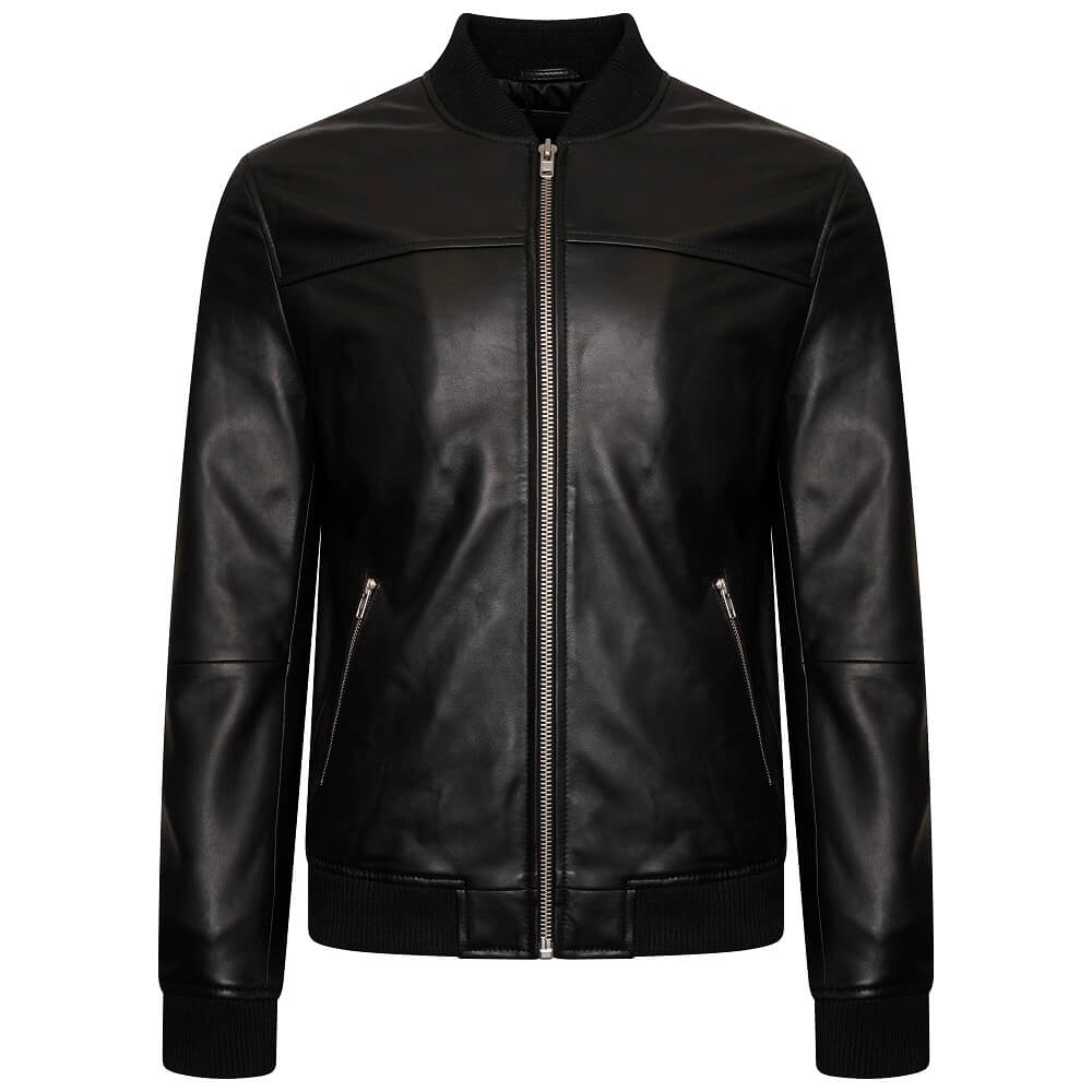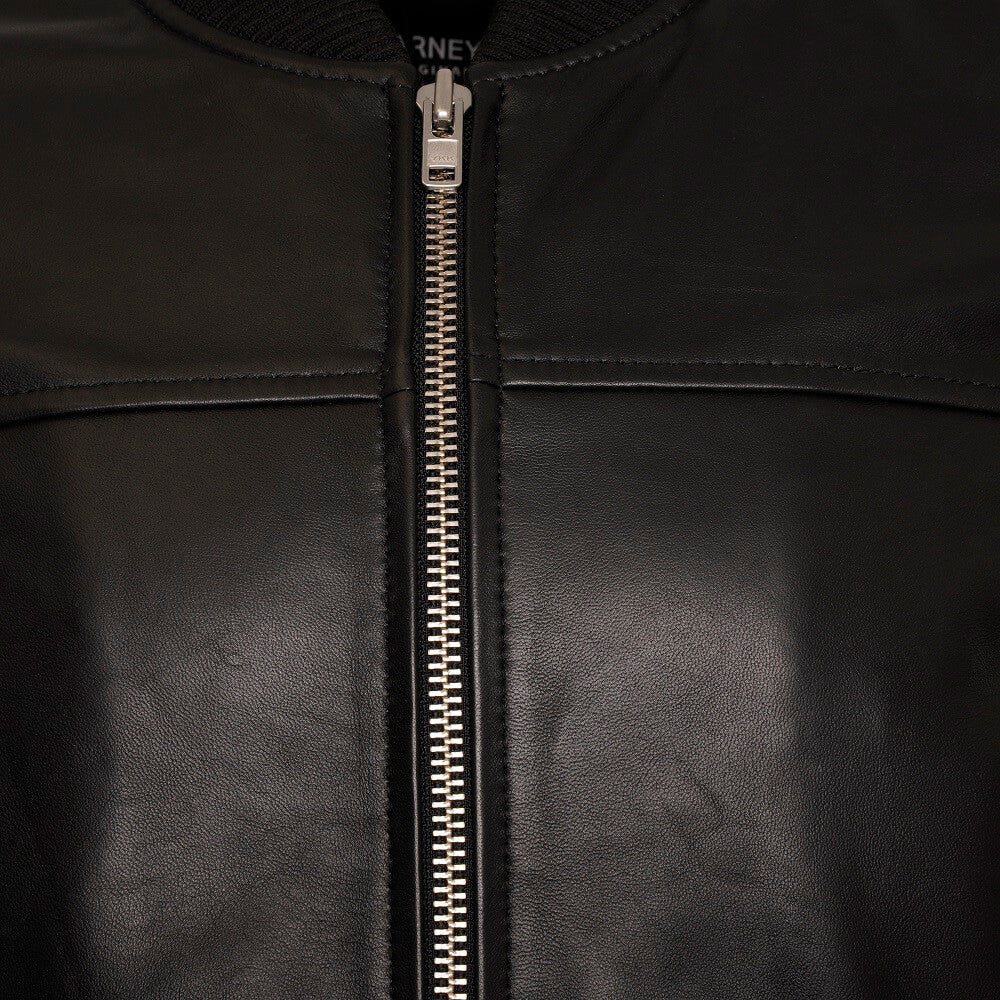 This classic leather bomber jacket is essentially a less textured version of our best seller. With a super smooth finish and ribbed waist & cuffs, this key piece is a must have for year round wear. This classic bomber features black leather with silver colored metal hardware.