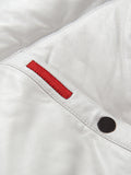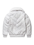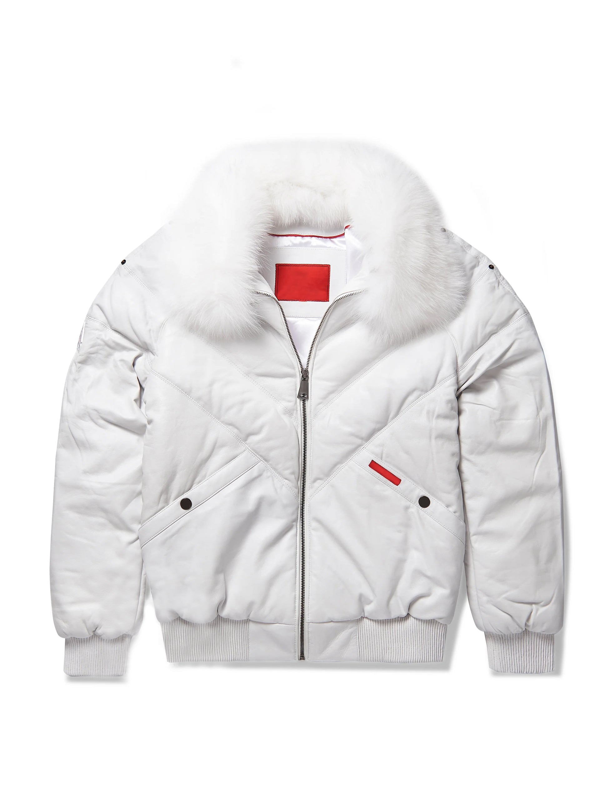 Our Staple Jacket the Men's V-Bomber with chevron bubble. Made of premium lamb skin leather with a detachable full skin fox collar. The modern version of the classic v-bomber. The body is grey lamb skin, the collar is genuine silver fox. Tested, Perfected Fit.