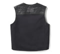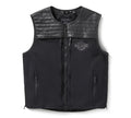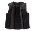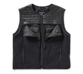 Sensible and stylish coexist on our H-D® Long Haul Utility Vest. Made rugged from a mix of heavyweight nylon and cow leather with a lightweight mesh lining. Its two-way zipper front and leather-bound crew neck make it an easy, comfortable wear. This men’s vest also has reflective piping for enhanced visibility and zippered waist seams. But its biggest asset is storage—the whole front body has concealed, zip-closed pockets to organize your essentials, plus zippered hand and interior pockets for stashing more stuff. Branded with a hit of embroidery on the front and back for a more lowkey yet timeless Harley look.