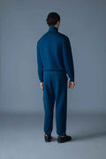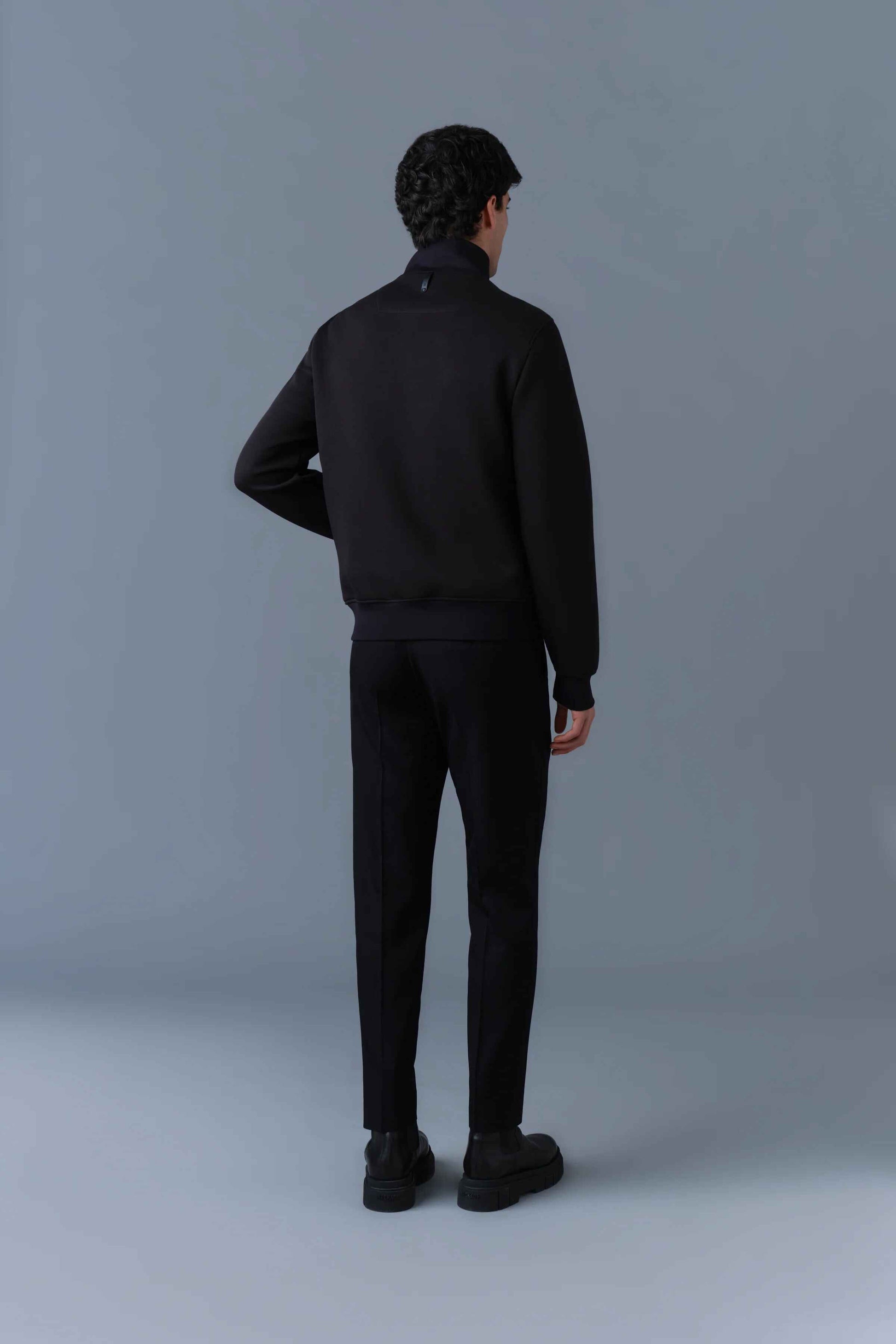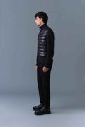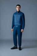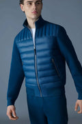 This is an transitional jacket for men with a classic bomber style. Expertly tailored to slim fit, it features a recycled lustrous nano down front contrasted with soft double face jersey sleeves and back. The rib knit stand collar and trims add tactical detailing and warmth. A modern multi-season layer with effortless style.