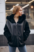 Women’s Black Hooded with Black Fur Shearling Leather Jacket