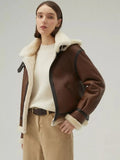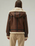 Women’s Chocolate Brown Removable Hood Leather Shearling Jacket