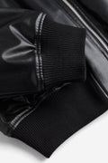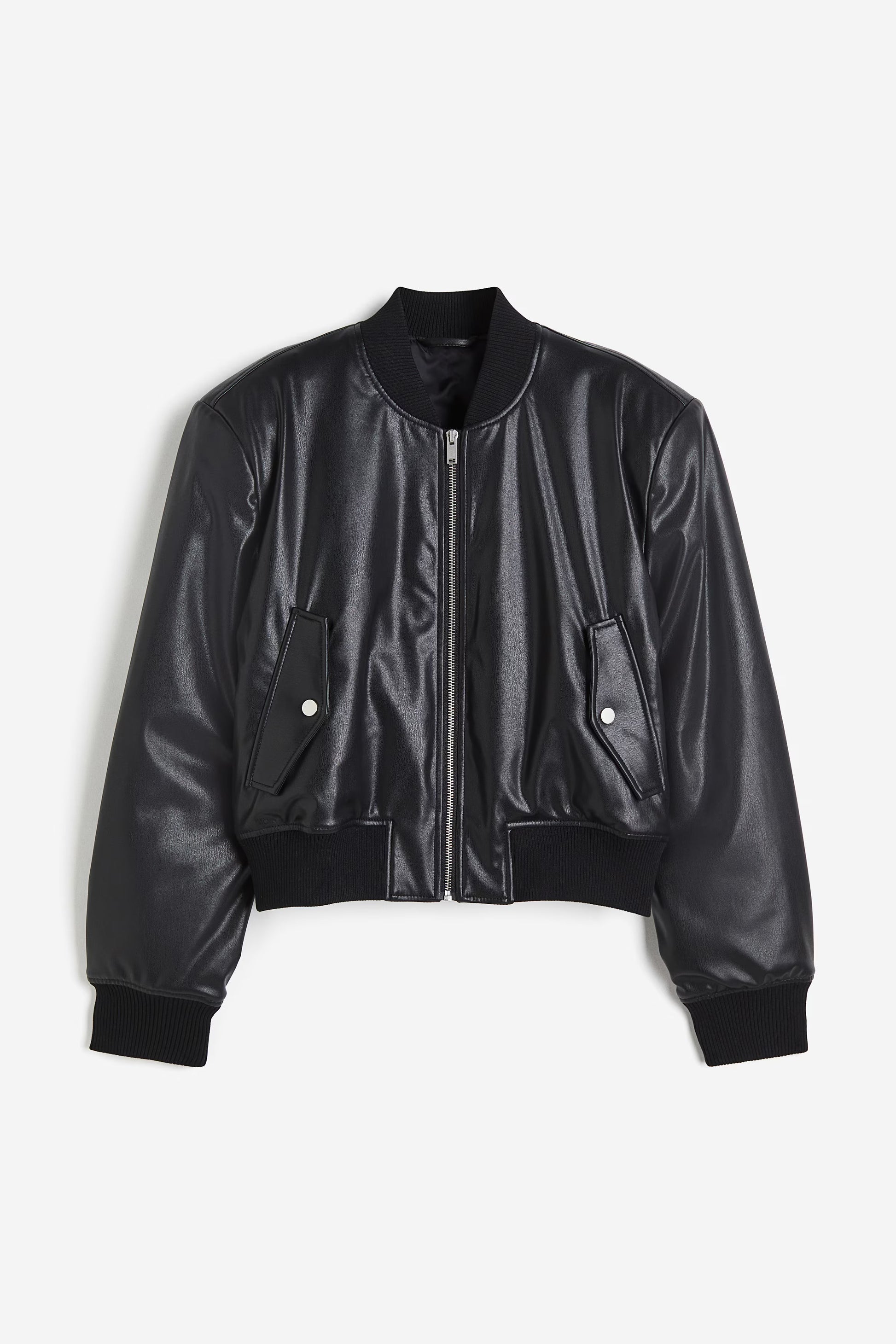 Short, loose-fit bomber jacket in coated fabric. Low collar, zipper at front, and front pockets with flap and snap fastener. Shoulder pads, long sleeves, and ribbing at collar, cuffs, and hem. Lined.