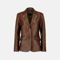 Made from genuine lambskin, the Lavinia Luster Blazer has a rich brown finish that looks trendy and comfy. This brown leather blazer is designed with a double-breasted front closure and a simple lapel for a clean look.