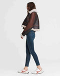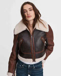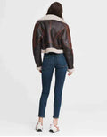 This women's sheepskin leather jacket offers ultimate comfort and coziness. It has a faux shearling fabric inner, which keeps you warm on cold winter days. The oversized collar adds an edgy touch to the design and the zipper closure for an easy fit makes it suitable for all body shapes. This item comes in a dark brown color that is sure to match any outfit