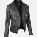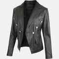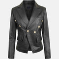 By incorporating open hem cuffs and a traditional notch collar, this blazer effortlessly merges elements of elegance and contemporary style. The design of this leather blazer women is casually updated with the inclusion of exposed hem cuffs, whereas the notch collar contributes to a sophisticated and sophisticated silhouette. This leather blazer women provides functionality without sacrificing fashion, as it is equipped with two exterior pockets. Whether you require storage for your phone, keys, or other indispensable items, the provided area offers sufficient capacity to safeguard and conveniently retrieve your possessions.