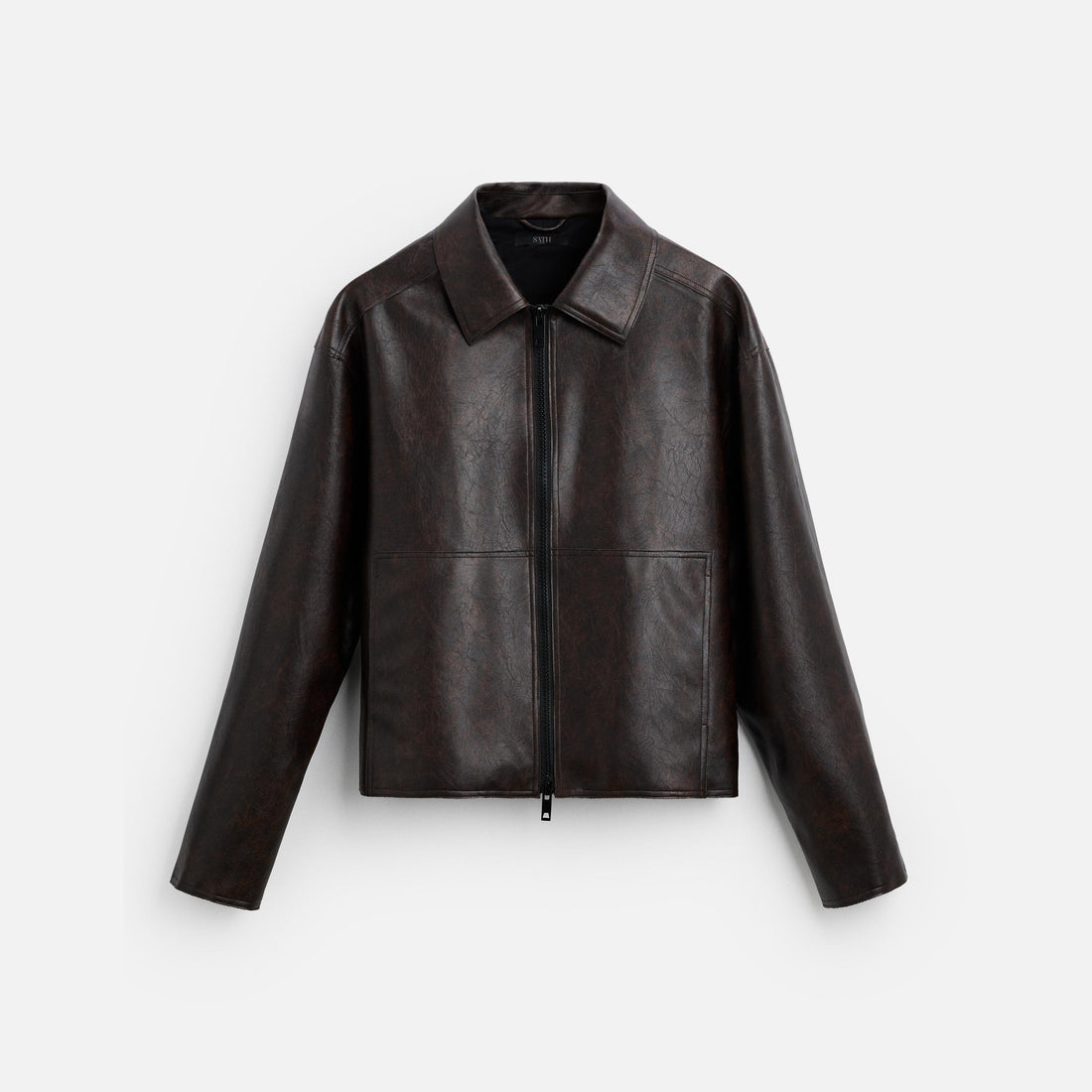Boxy fit leather jacket. Lapel collar and long sleeves with adjustable zip cuffs. Welt pockets...