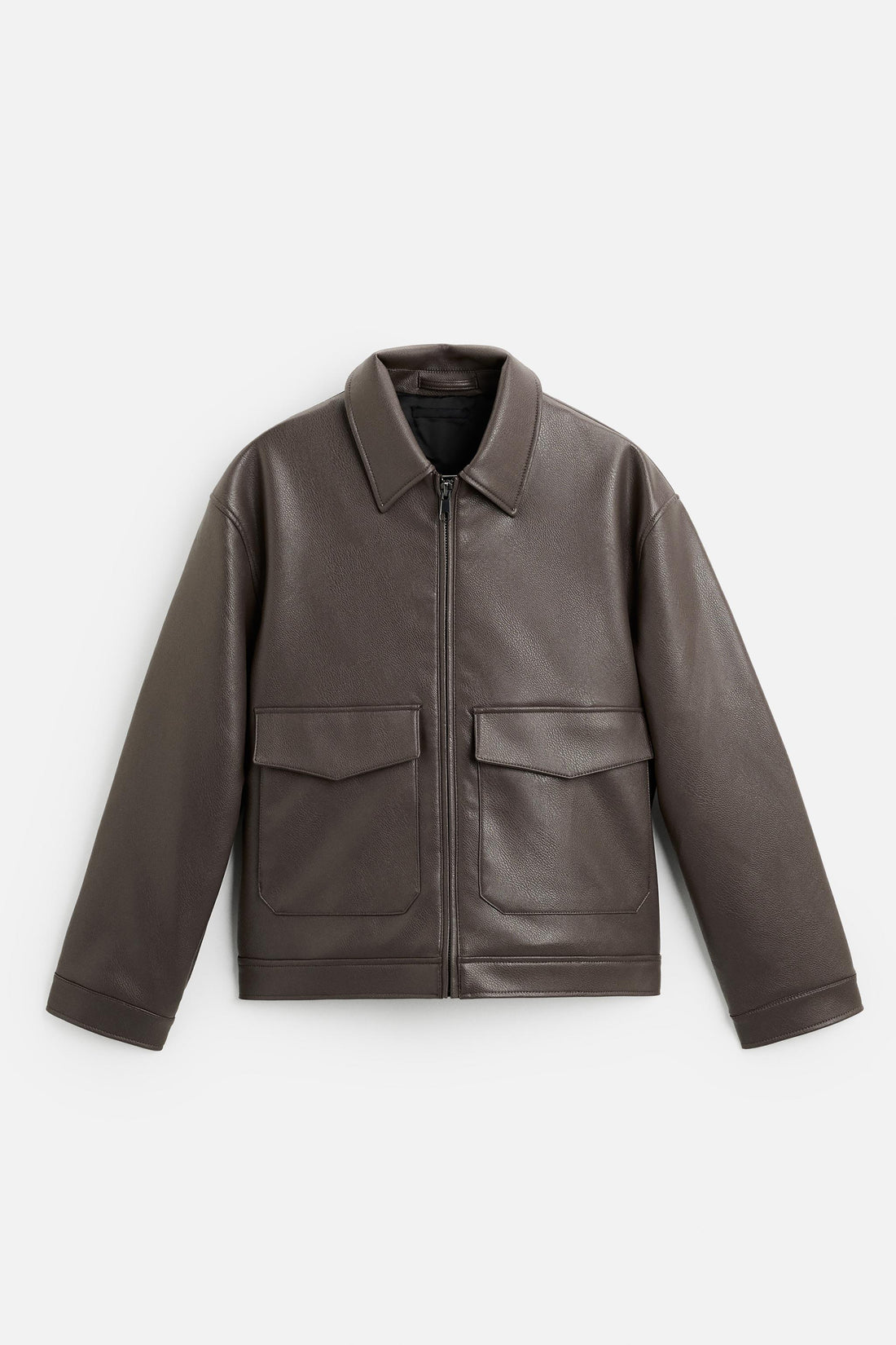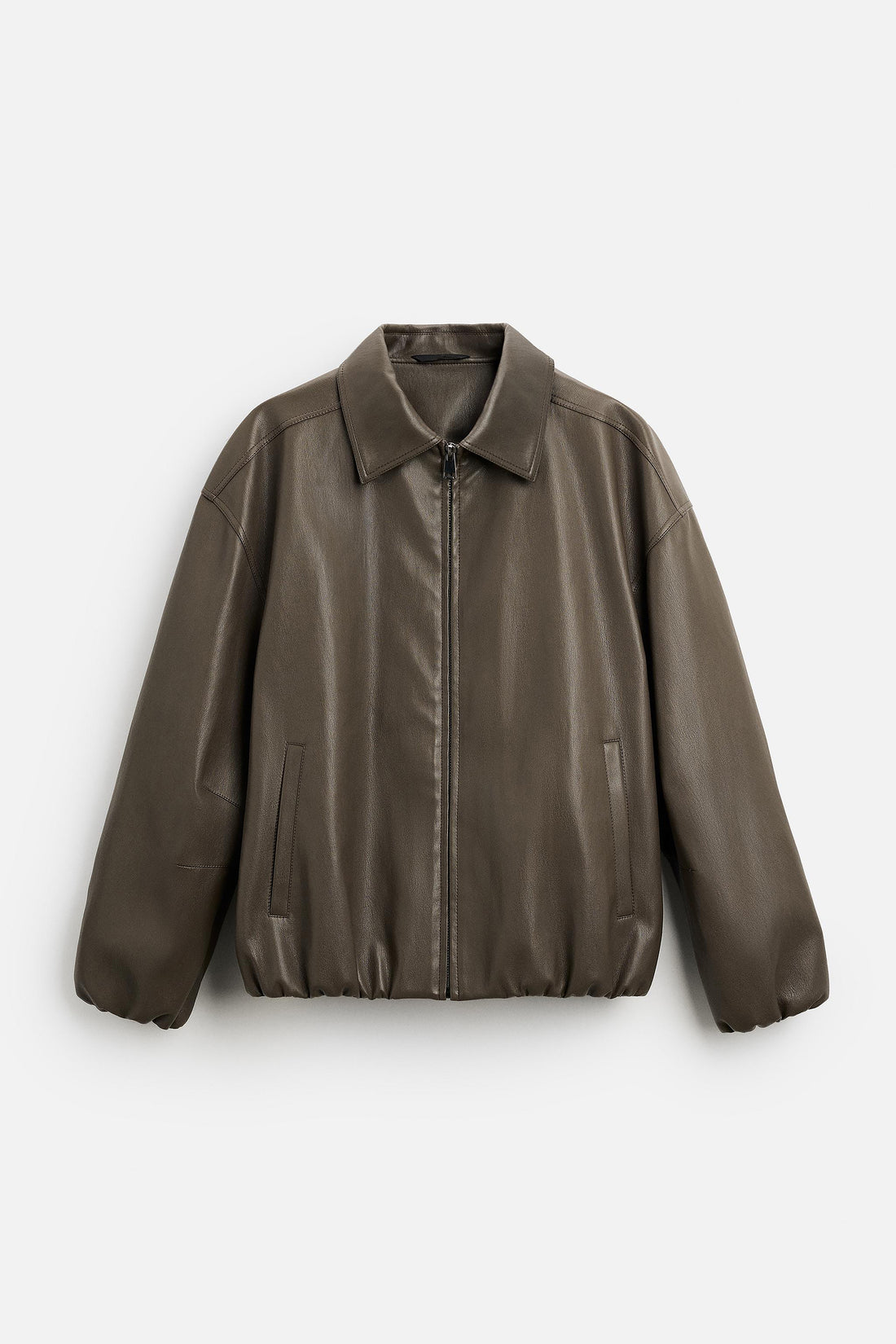 Relaxed fit jacket in a leather-effect fabric. Lapel collar and long sleeves with elasticated cuffs....