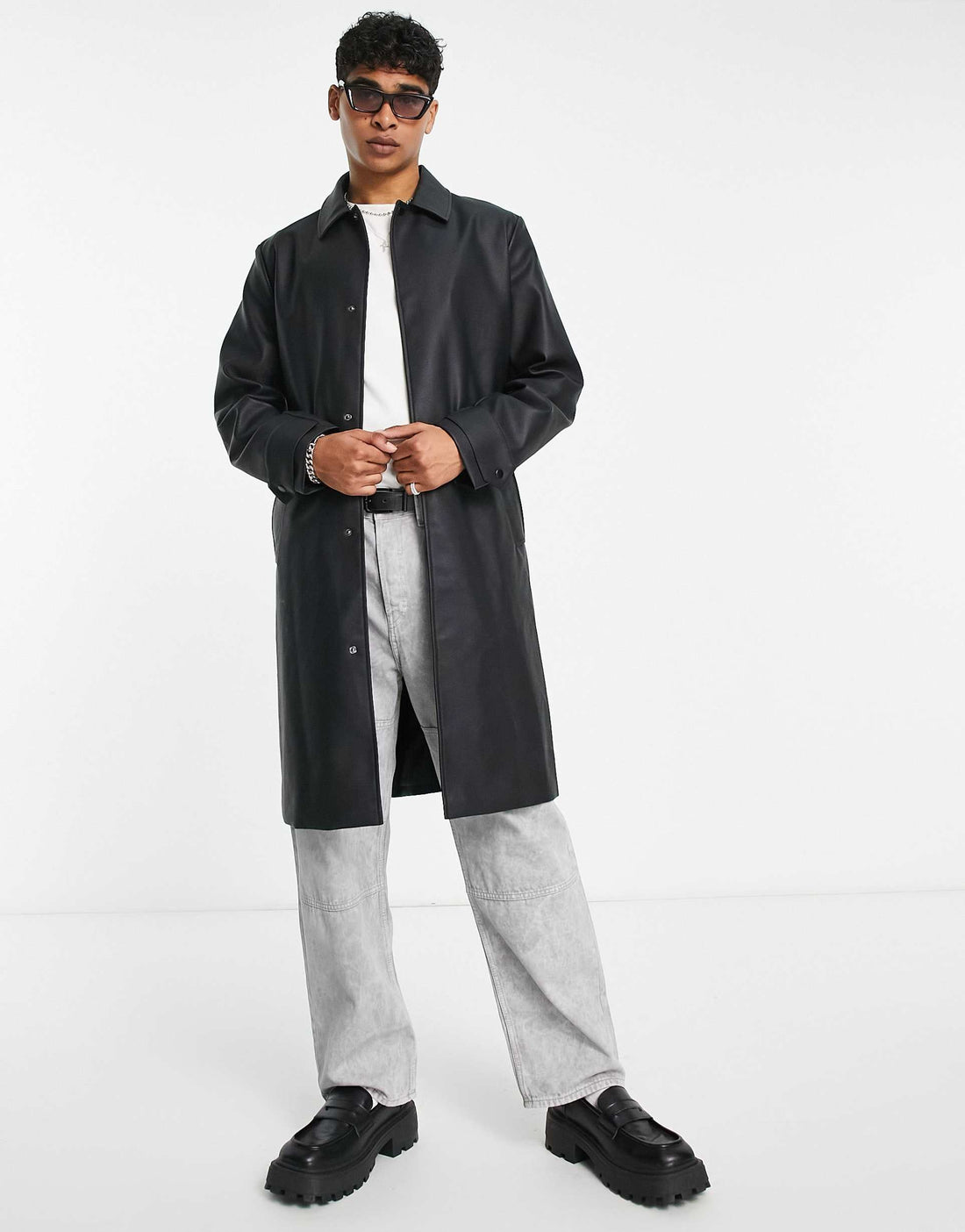 Men's Oversized Leather Trench Coat with Belt in Black
