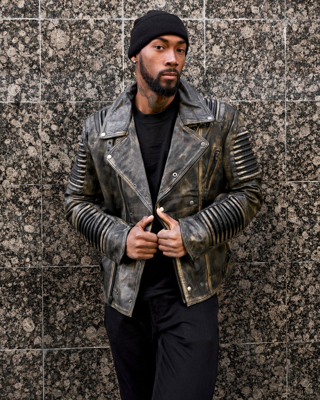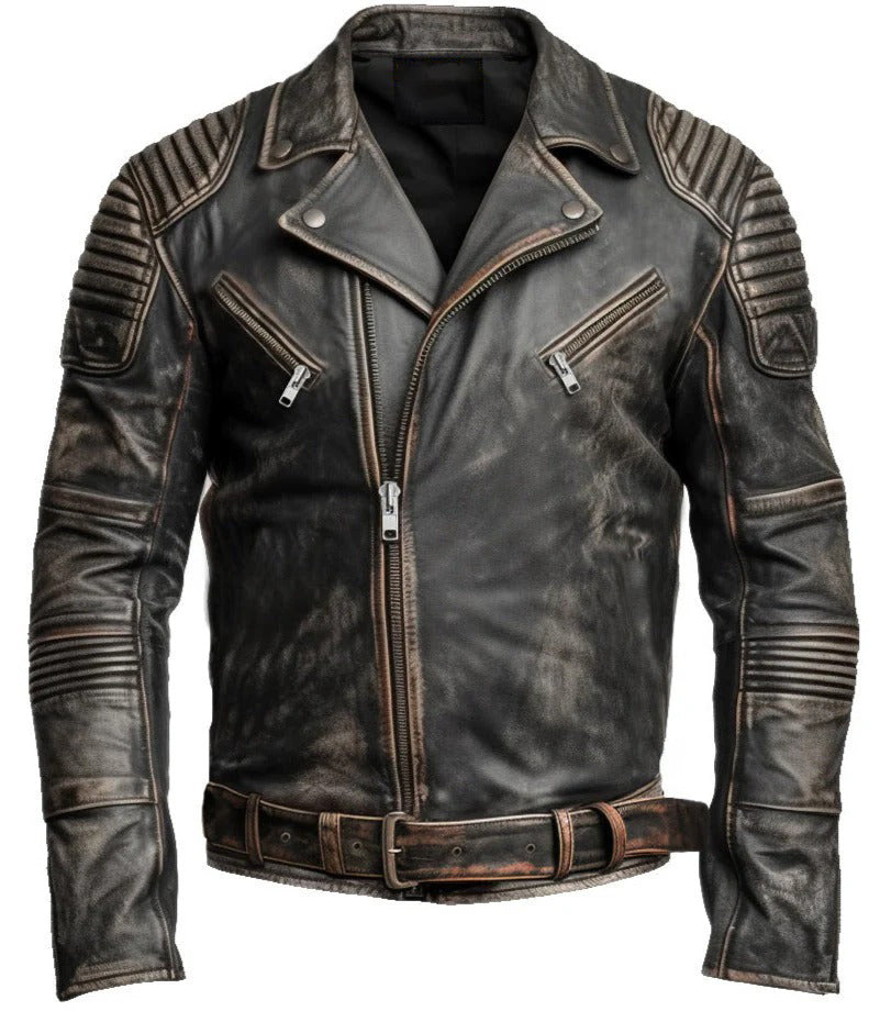 Men's Black Distressed Leather Biker Jacket