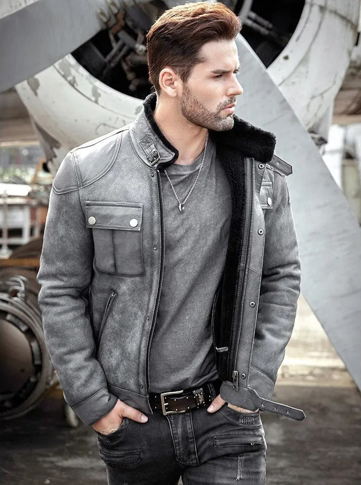Men's B3 Winter Fur & Shearling Leather Jacket in Grey