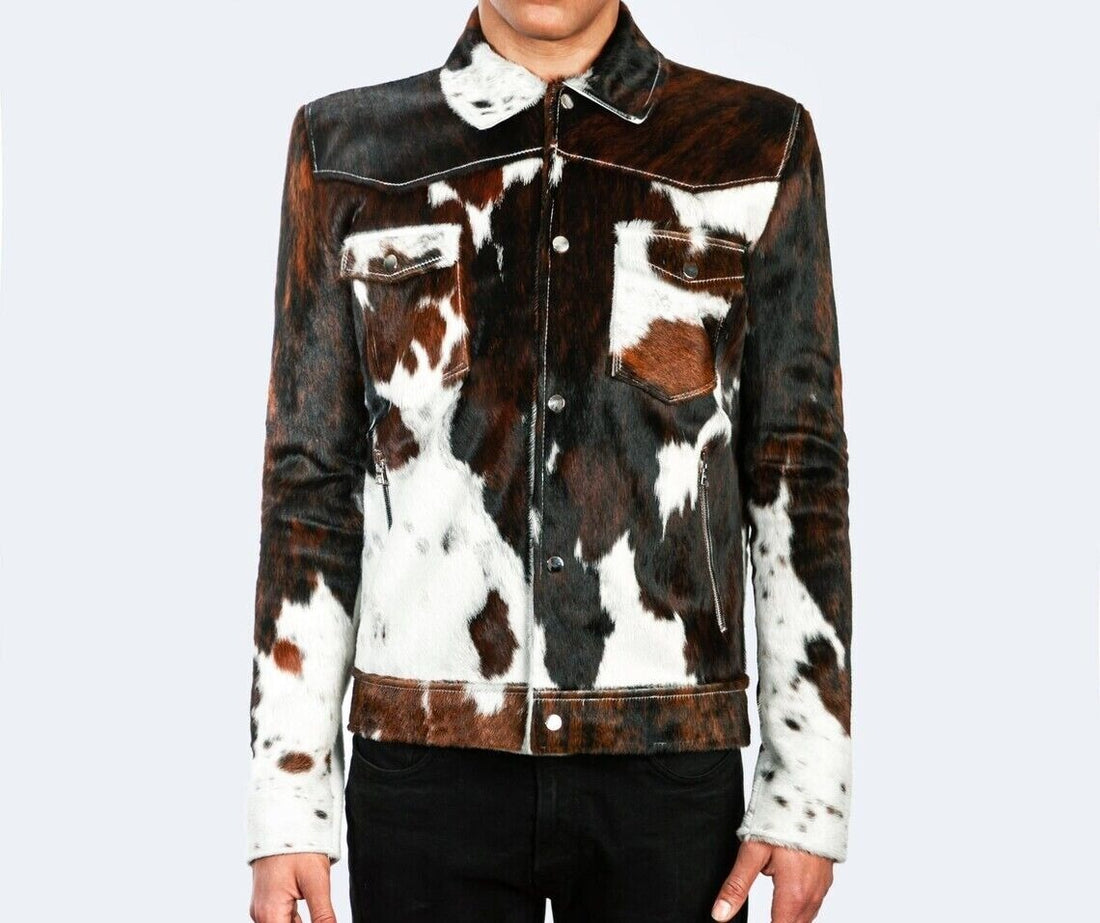 Description Crafted from authentic hair-on cowhide leather, this statement jacket combines rugged texture with runway-ready...
