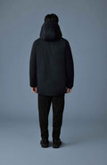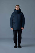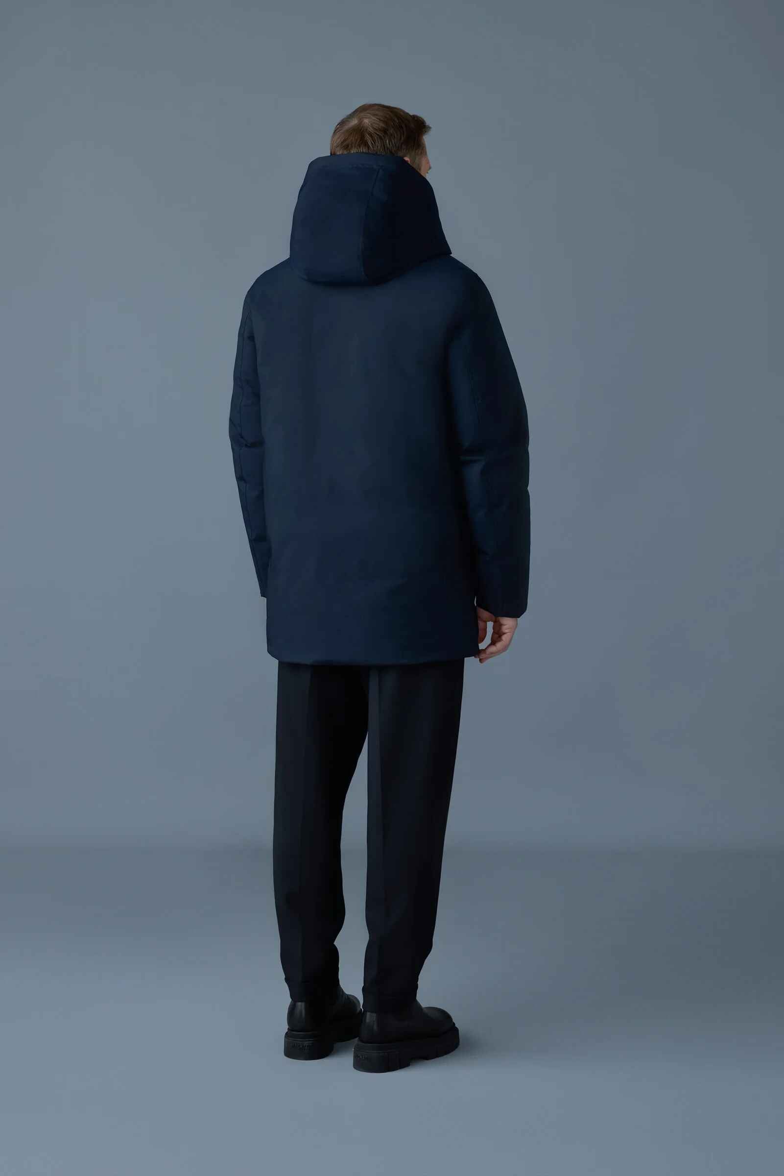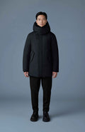 This is a  down jacket for men with a removable hooded bib. Water-repellent and windproof, the shell is made from a breathable and air-permeable 2-layer fabric to keep you comfortably warm outdoors while preventing overheating during a commute. Engineered for maximum warmth in the most extreme temperatures, it boasts storm cuffs and insulated pockets. Cinch the drawcord for extra protection. A winter performance piece with sartorial precision.