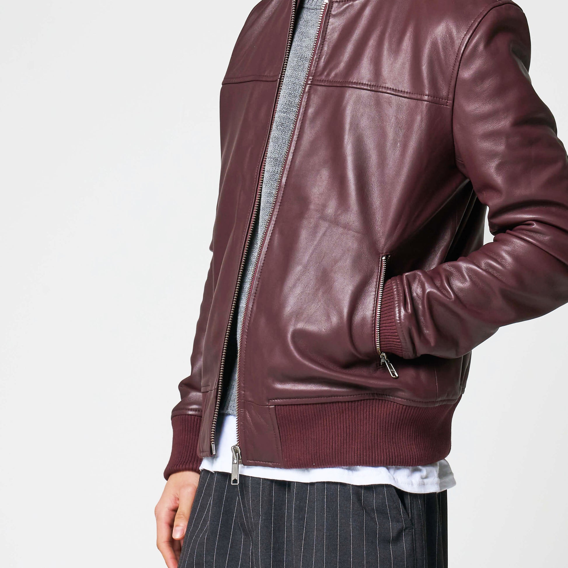 Is it time to ditch your staple color palette? This burgundy leather bomber jacket brings a fresh take on a timeless classic. Crafted from real sheep leather, it is lightweight and designed for everyday wear. Ribbed cuffs, hem, and collar give it that authentic bomber jacket feel, keeping things casual yet smart. With two secure zipped pockets, it’s as practical as it is stylish.