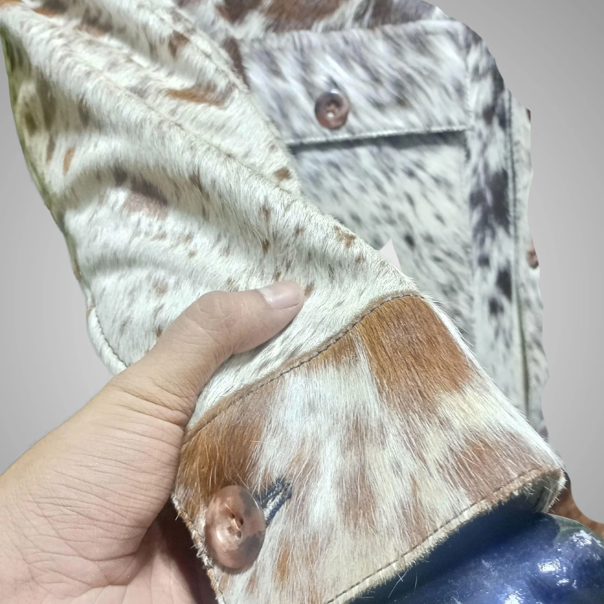 Available in a range of sizes, this cowhide jacket is tailored for comfort and a flattering fit that complements all body types. The natural pony hair cow print pattern is distinct and eye-catching, making it a statement piece in any wardrobe. The jacket features sturdy stitching and quality hardware to enhance its longevity and functional style. Whether you’re dressing up for a themed party or seeking a timeless piece for your collection, this jacket is a versatile choice.