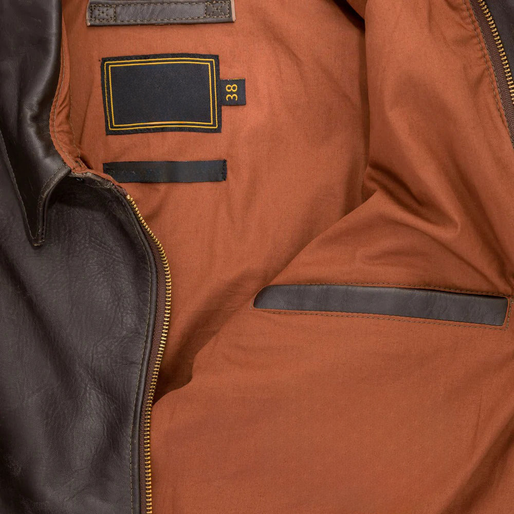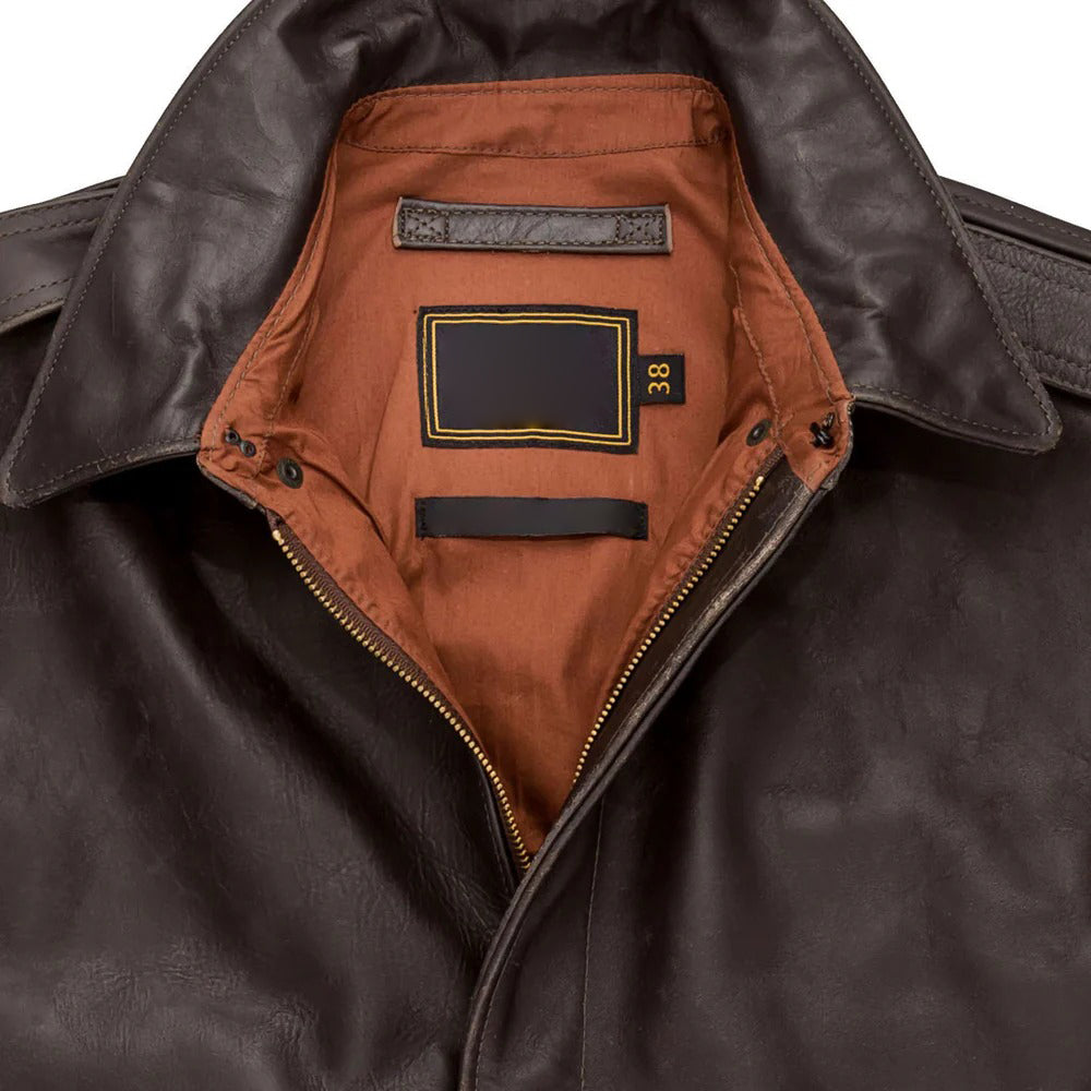 The 40th Anniversary A2 Long Length Horsehide Leather Jacket is a special edition of the iconic WWII U.S Air Force bomber jacket, now crafted from specially weathered and tanned horsehide leather. This unique version offers all of the authenticity of our hand-painted nose art jackets while giving the wearer the option of creating their own design on this beautiful blank canvas. Since many of the original A-2 jackets in our archive show olive thread stitching we made our version with contrast stitching thread giving it that extra authentic touch. The horsehide leather we use for this brown bomber jacket has been expertly finished to allow your garment to develop a patina, yielding an aged and vintage appearance. These natural shadings and characteristics are by design and a normal process exclusive to Cockpit USA. Order this brown leather bomber jacket today!