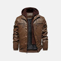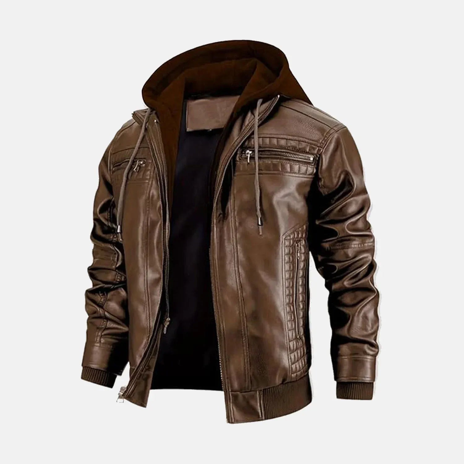 Designed to survive the hustle and bustle of city life, this leather jacket with hood is the ideal companion for urban travelers who are looking for both style and functionality in their clothing. Your appearance is enhanced with a touch of adaptability thanks to its detachable hood, which enables you to effortlessly adjust to changing weather conditions while still retaining your trademark style. This hooded leather jacket provides a generous amount of storage space for your things while you are on the go, as it is equipped with four pockets on the outside and two pockets on the inside. You can rely on this to keep your possessions safe and within easy reach at all times, regardless of whether you are traversing the bustling streets of the city or going on impromptu excursions in the city. Since the quilted polyester inside offers both warmth and comfort, this item is an excellent option for wearing on cold days in the city. This hooded leather jacket is a great example of how convenience and traditional design elements can be combined to create a jacket that is both secure and easy to wear throughout the day. It has a zipper closure and a band collar that is fastened with snap buttons.