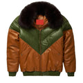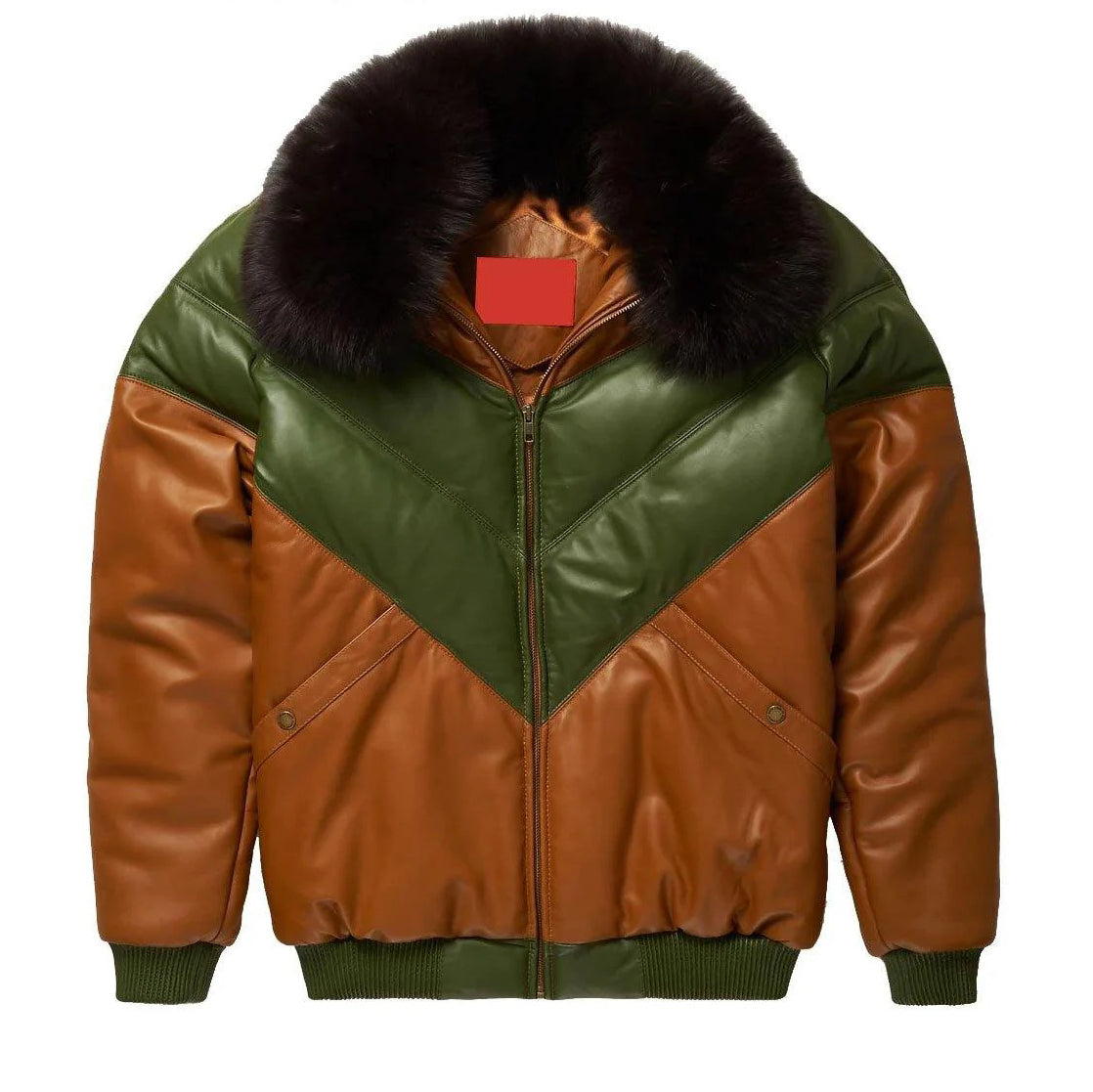 Men's Fox Fur Collar Lambskin Leather V-Bomber Jacket