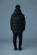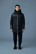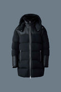 This is a sustainably-made mixed-media quilted down Jacket with plush shearling paneling throughout. Water-resistant and repellent, a storm visor hood and adjustable bungee at hem add utilitarian performance and create a striking silhouette. Expertly designed from top to bottom with leather tape detailing and stand collar with removable hood. A standout hybrid winter staple with a contemporary cut.