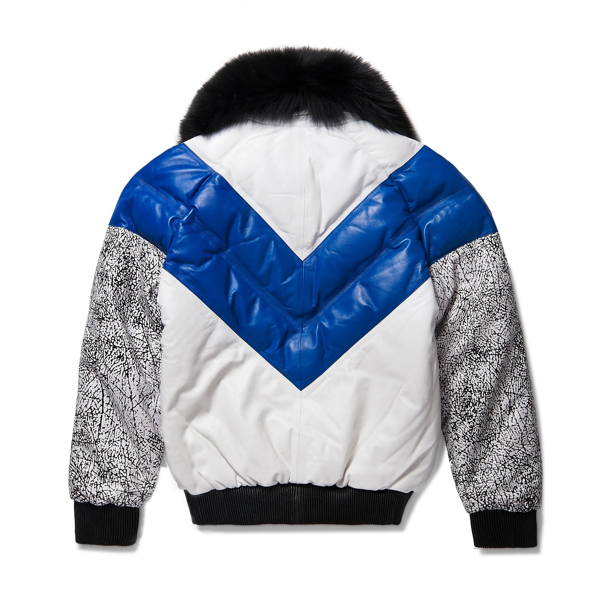 Our Staple Jacket is the Men's V-Bomber with a chevron bubble. Made of premium lamb skin leather with a detachable full-skin fox collar. The modern version of the classic v-bomber. The body is grey lamb skin, the collar is a genuine silver fox. Tested, Perfected Fit.