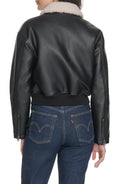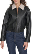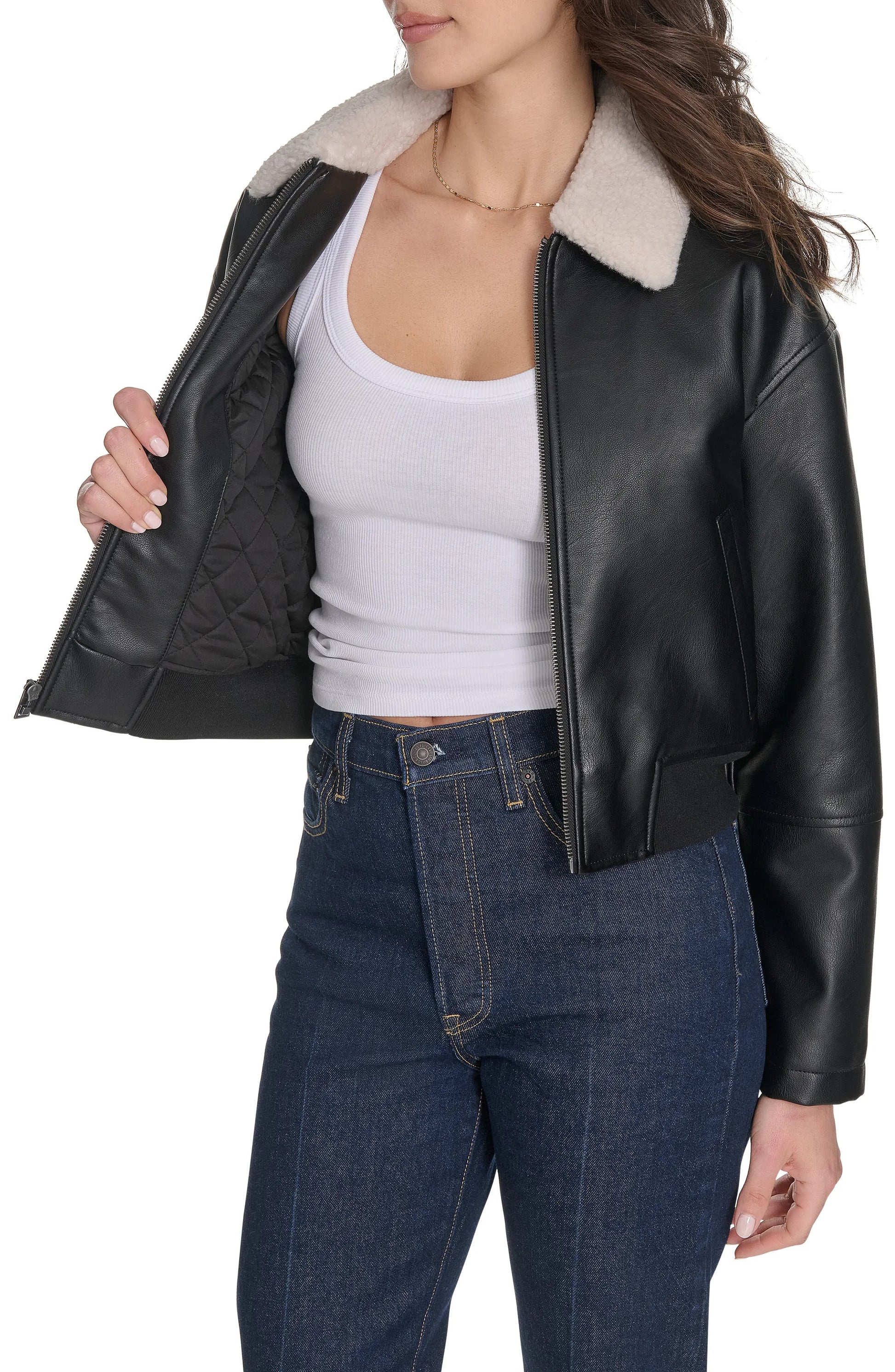 A cozy faux-shearling collar brings an aviation-inspired aesthetic to this faux-leather bomber cut in a boxy, softly cropped silhouette.