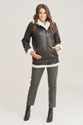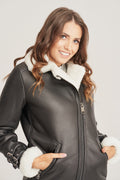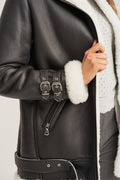 Oversize winter women's sheepskin aviator jacket with a sporty character. Made of natural, soft and delicate lambskin. Fastened with a zipper slightly shifted to the side. Women's sheepskin aviator jacket has straps finished with a buckle with the possibility for width adjustment. Rolled up sleeves and the bottom of the sheepskin coat give the character of a flight jacket.